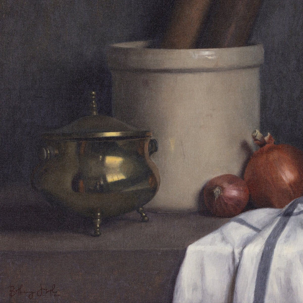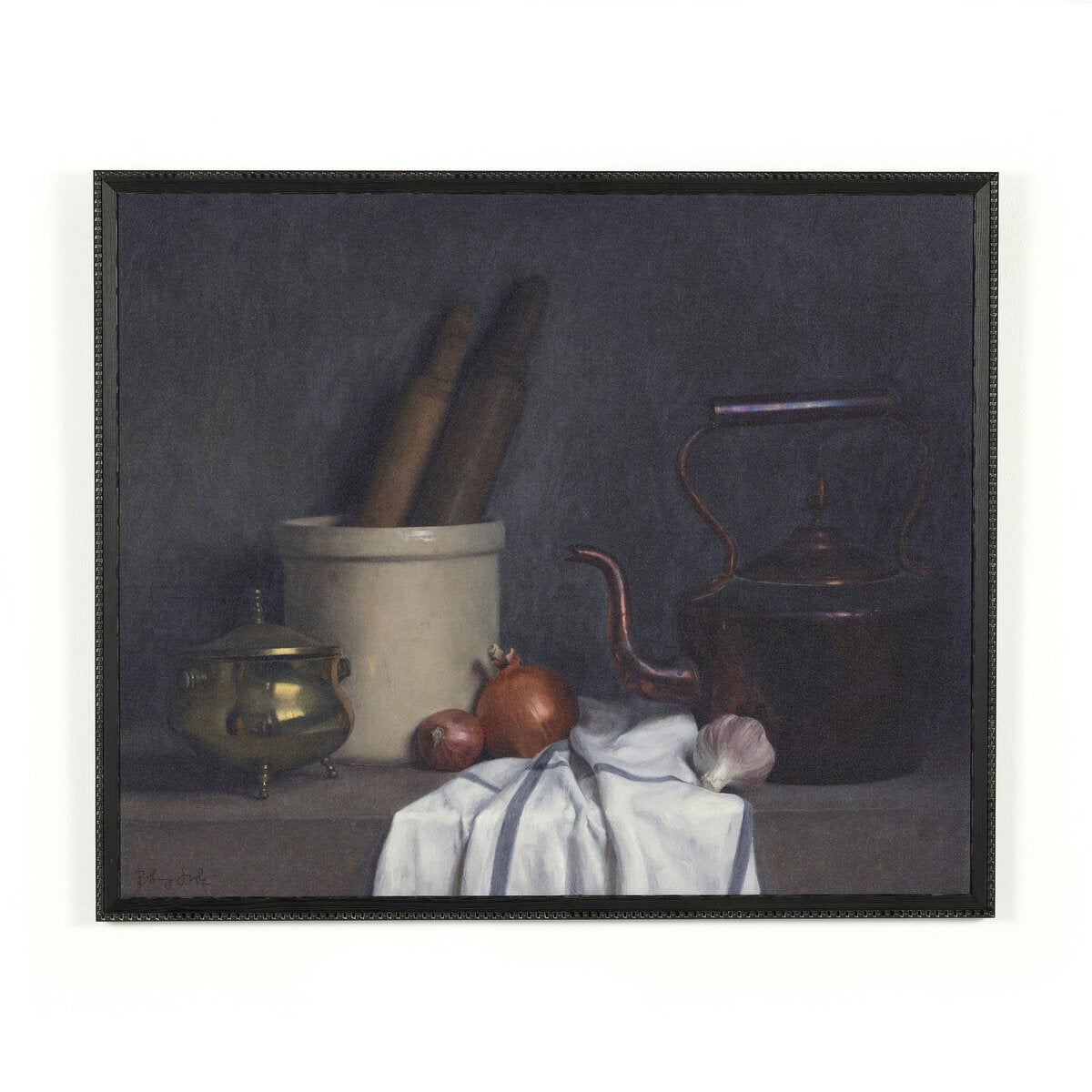 A fifth-generation artist, oil painter Bethany Joseph specializes in portraits and still lifes, painting on linen then layering and texturizing for depth. A native of Fort Worth, Texas, her realist pieces aim to represent the beauty of simplicity. Finished within a decorative Brimfield black frame of naturally distressed painted pine. Handmade in Austin, Texas.
