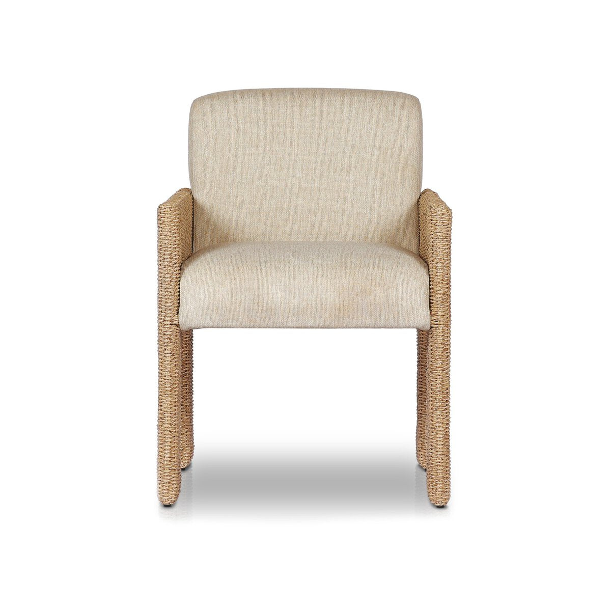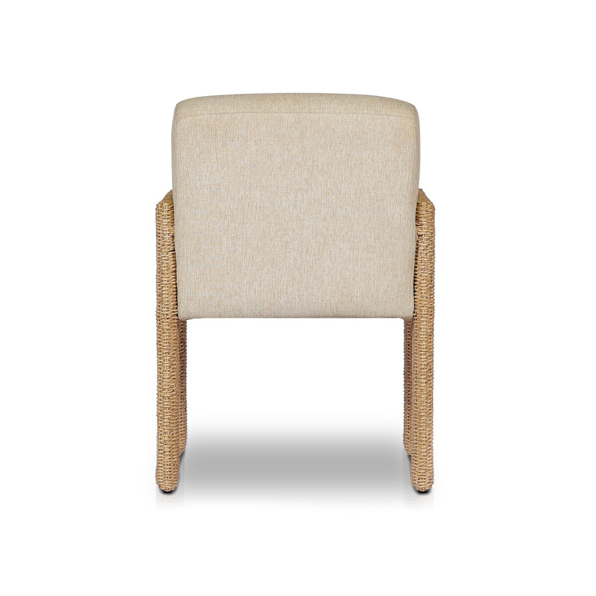 Think outside the box for outdoor dining. A structured, voluminous seating style pairs upholstery with woven legs for a two-tone look, bringing a traditional silhouette with maximum comfort. Cover or store indoors during inclement weather and when not in use. Our Weatherproof Outdoor Dining Chair Cover in size large fits this chair.