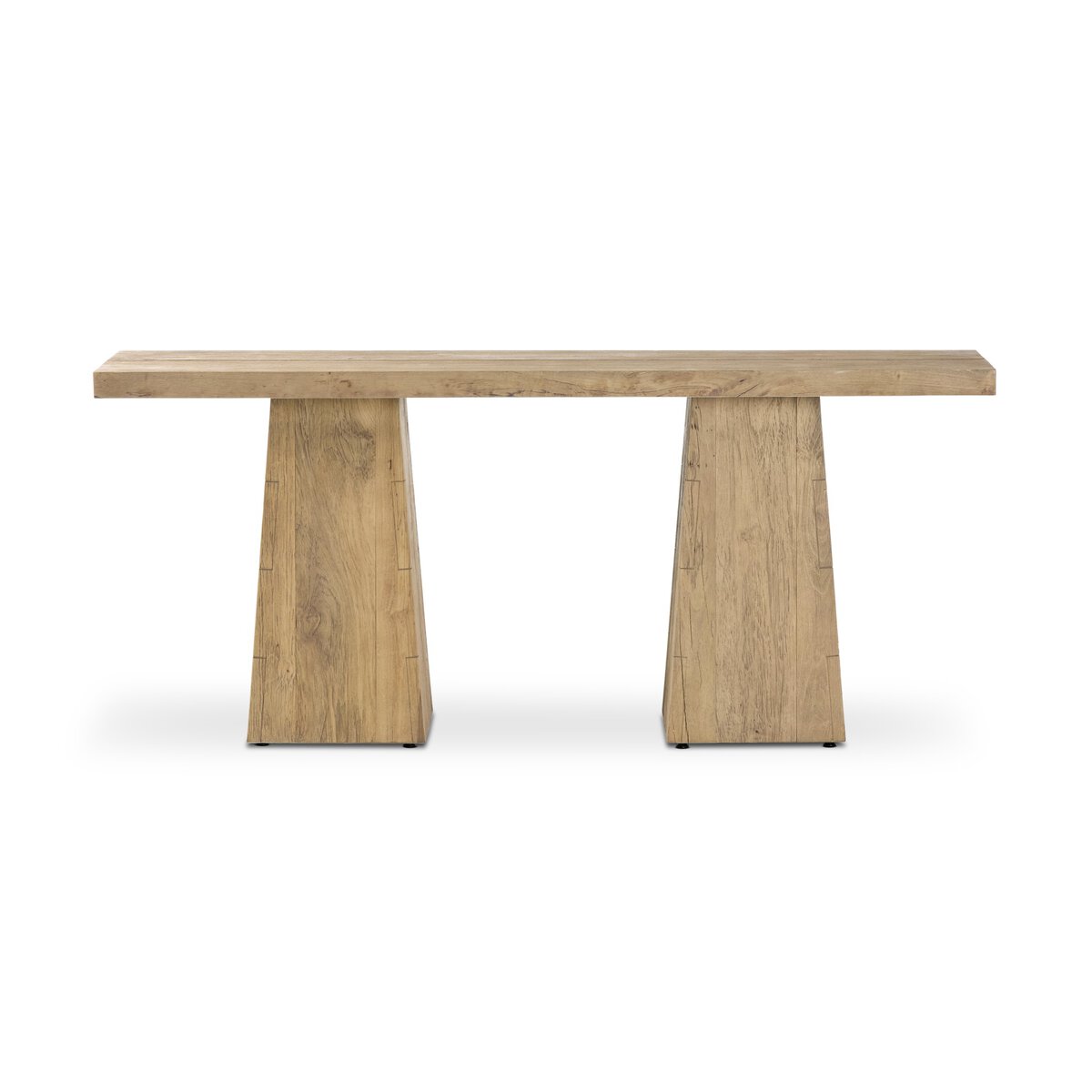 Overall Dimensions 70.00"w x 18.00"d x 30.00"hItem Number 247001-002Colors Bleached AlderMaterials Resawn Alder VeneerWeight 101.41 lbVolume 24.58 cu ftClearance from Floor 1 28.00"Distance between Legs (Side to Side) 1 19.00"Leg/Base Depth 1 14.00"Leg/Base Height 1 28.00"Leg/Base Width 1 14.00"Overhang Width 1 11.50"Tabletop Thickness 2.00"Weight Capacity 100 lb