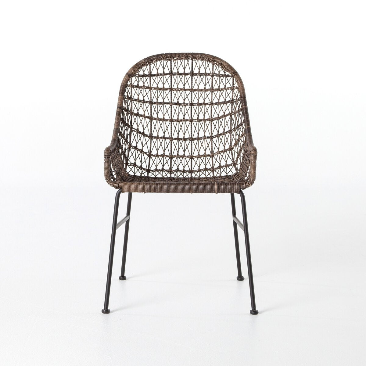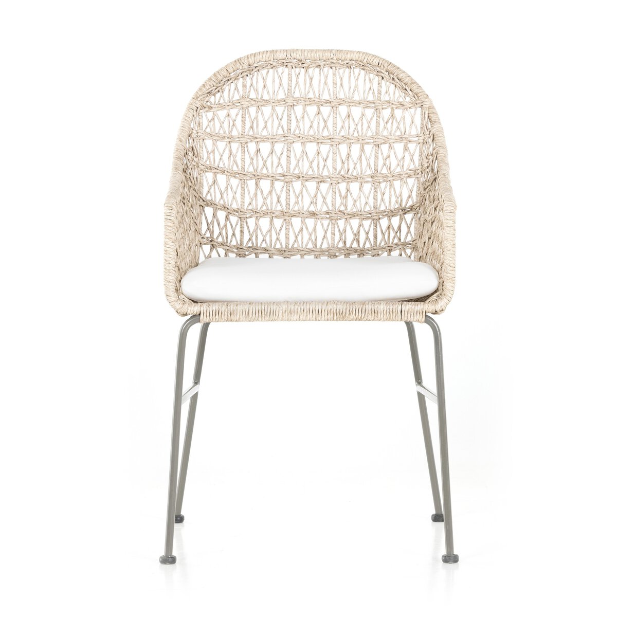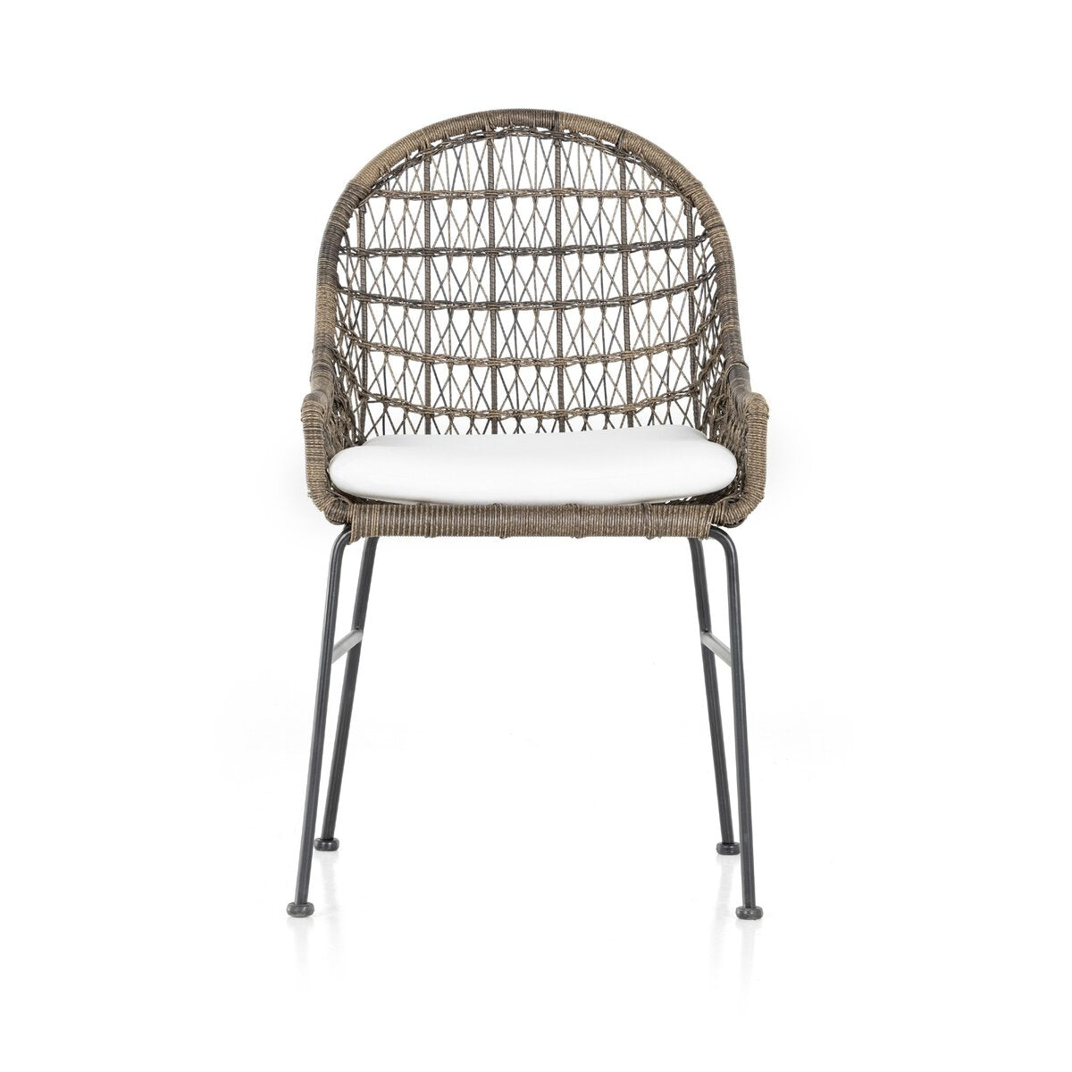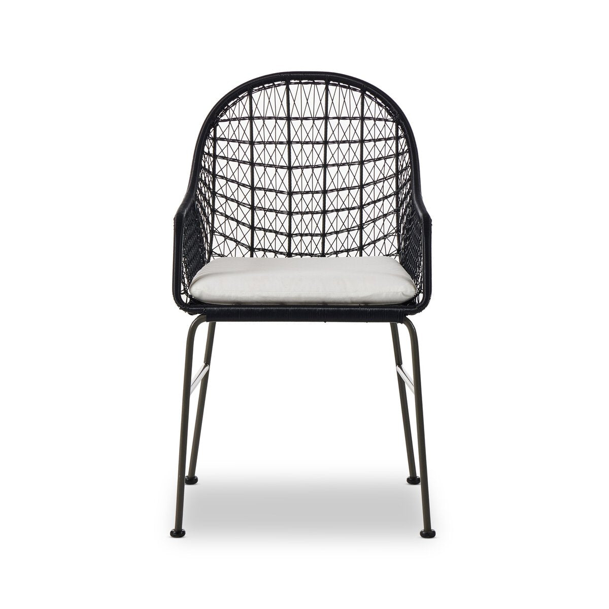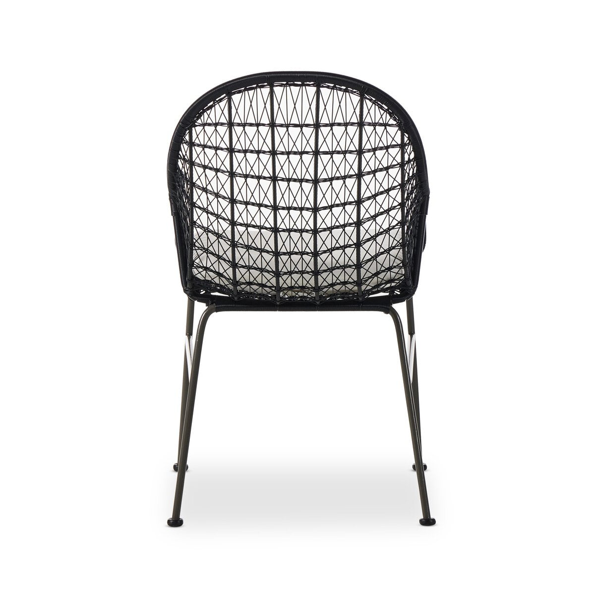 Clean, contemporary shaping and an updated weave transform all-weather wicker into something modern. This high-texture dining chair is supported by a contrasting bronzed iron base, with a white seat cushion for comfort. Cover or store indoors during inclement weather and when not in use.
