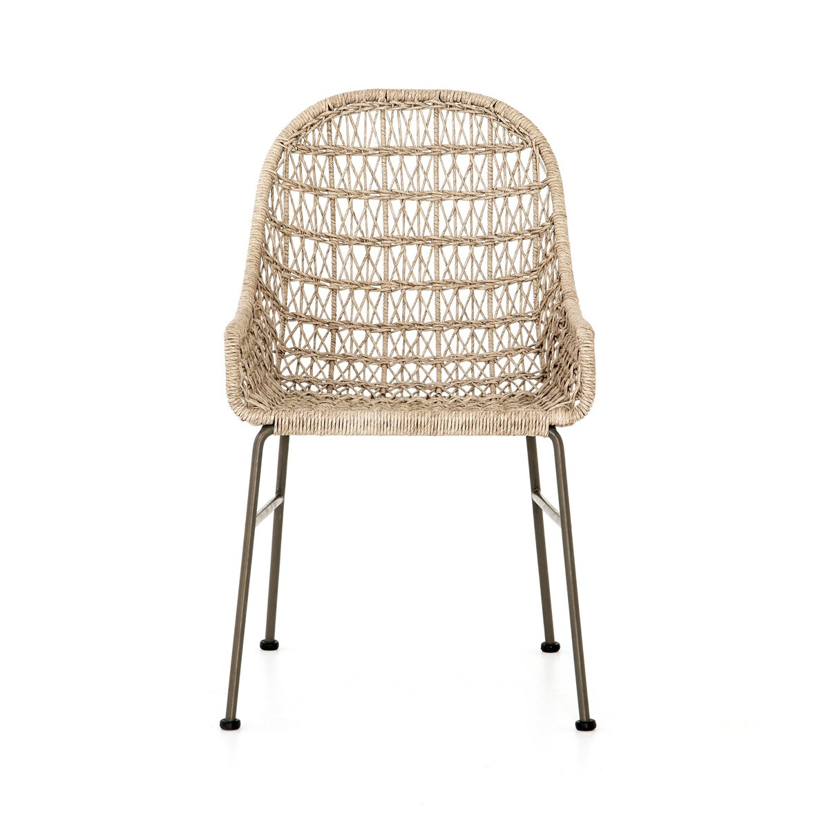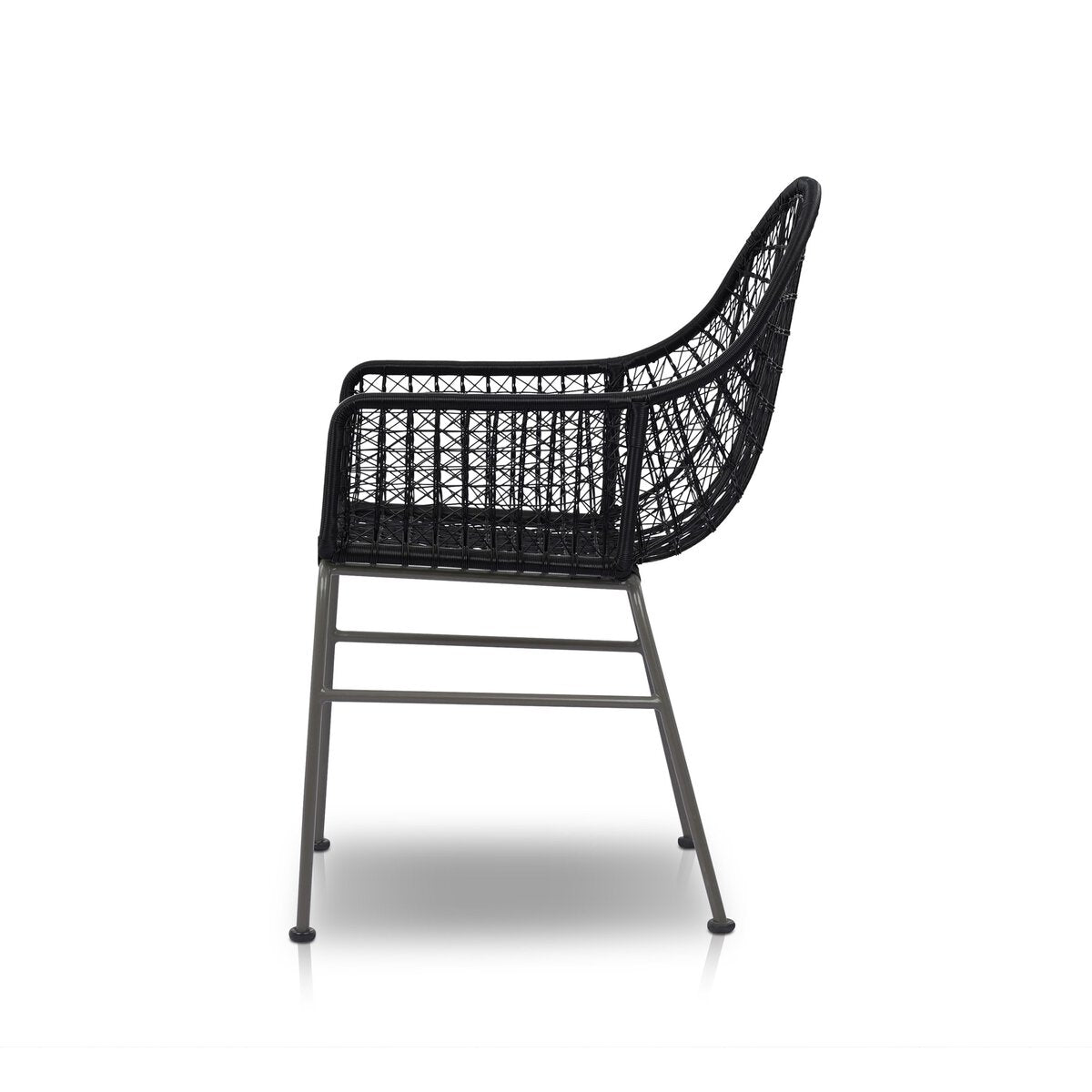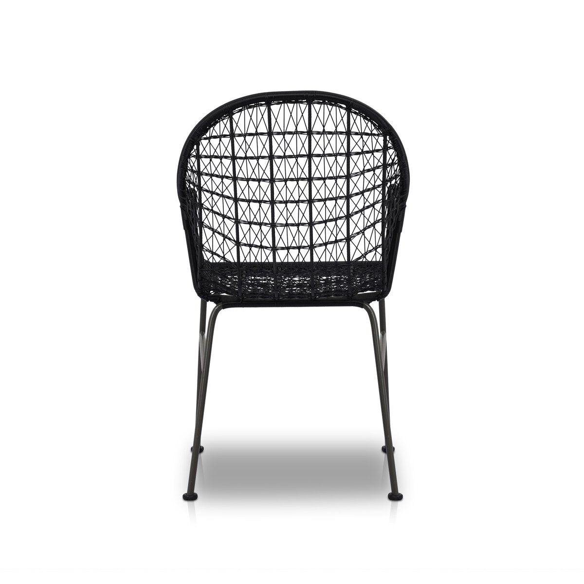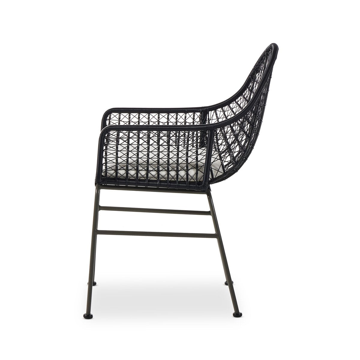 Clean, contemporary shaping and an updated weave transform all-weather wicker into something modern. This high-texture dining chair is supported by a contrasting bronzed iron base, with a white seat cushion for comfort. Cover or store indoors during inclement weather and when not in use.