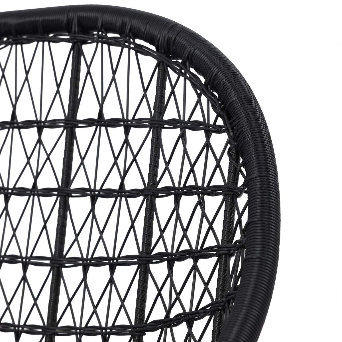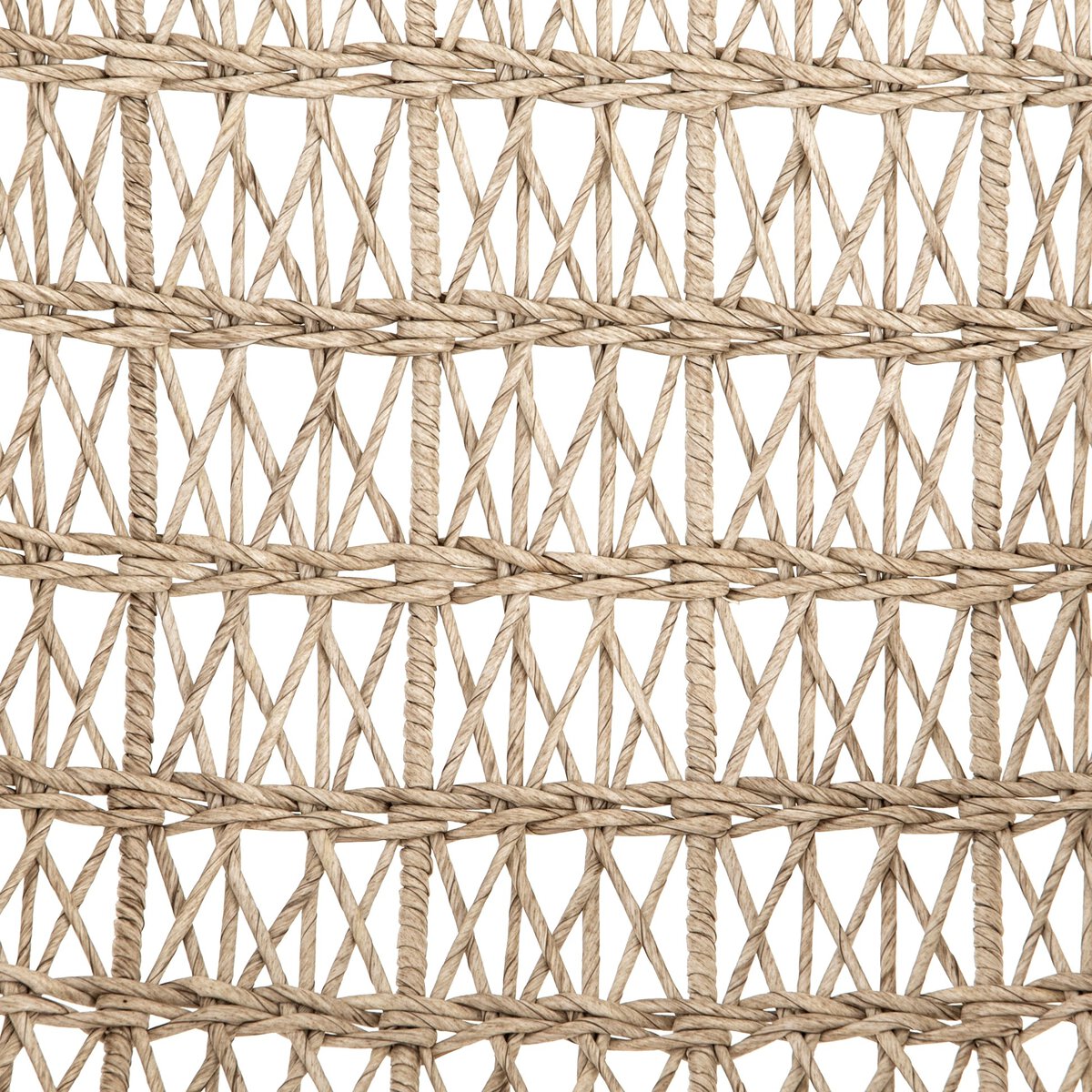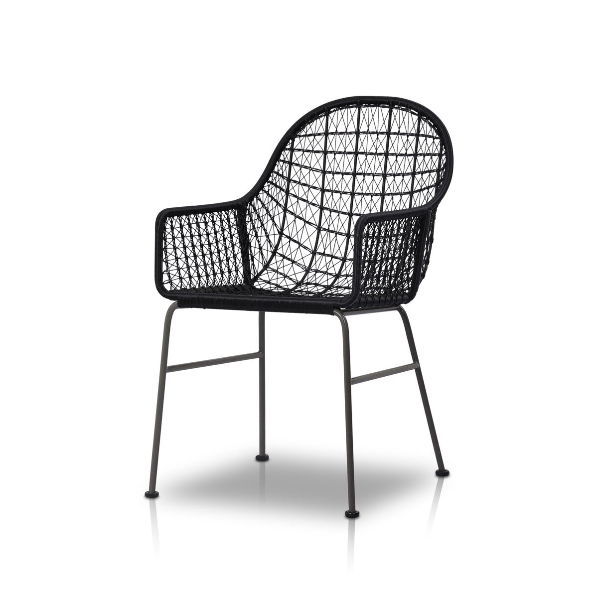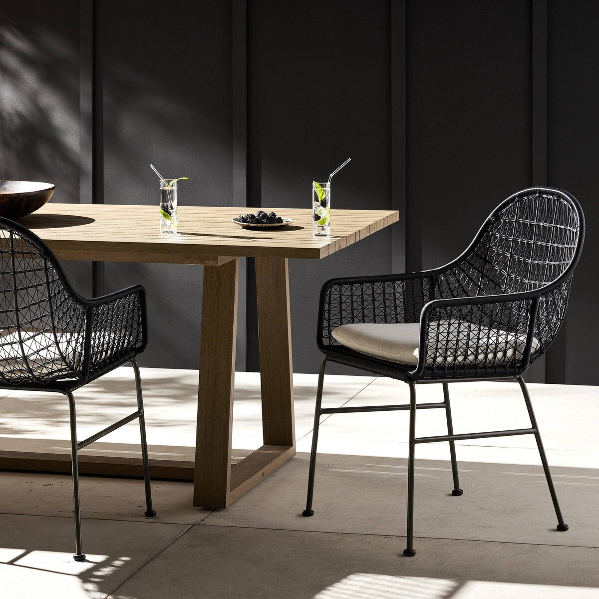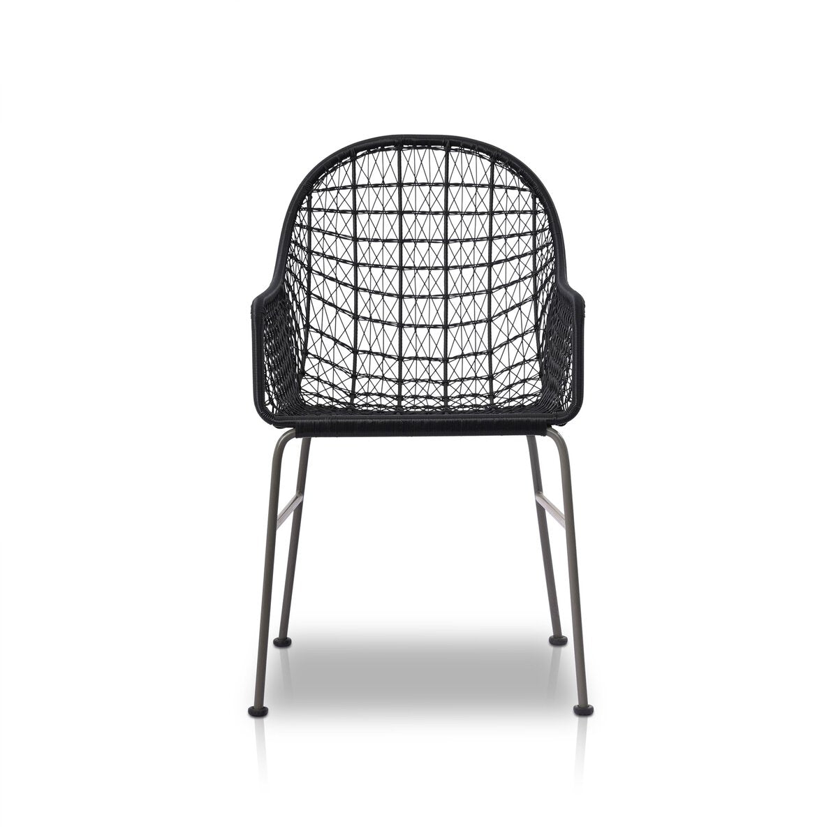 Clean, contemporary shaping and an updated weave transform all-weather wicker into something modern. This high-texture dining chair is supported by a contrasting bronzed iron base, with a white seat cushion for comfort. Cover or store indoors during inclement weather and when not in use.