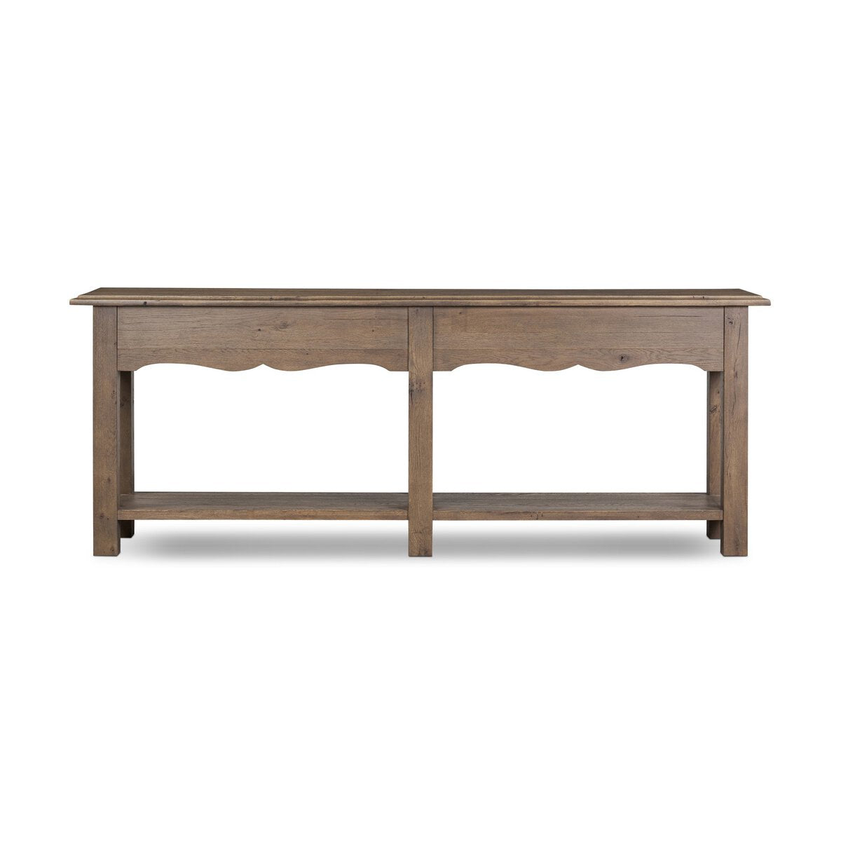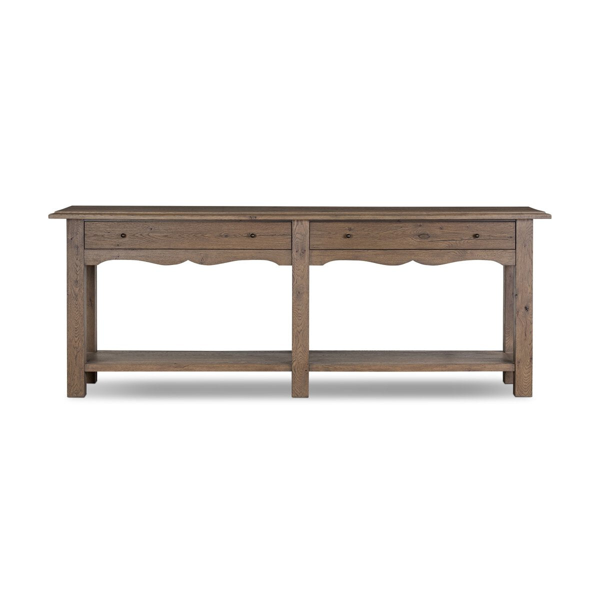 Overall Dimensions 86.50"w x 20.00"d x 32.75"hItem Number 251153-001Colors Brown Oak Veneer, Weathered OakMaterials Thick Oak Veneer, Solid OakWeight 155.42 lbVolume 49.97 cu ftClearance from Floor 1 4.49"Distance between Legs (Front to Back) 1 10.28"Distance between Legs (Side to Side) 1 36.06"Drawer Depth 1 12.05"Drawer Height 1 3.35"Drawer Opening Depth 10.63"Drawer Width 1 34.09"Fixed Shelf Depth 1 15.79"Fixed Shelf Height 1 1.26"Fixed Shelf Width 1 36.06"Interior Section Depth 1 15.79"Interior Section Depth 2 15.79"Interior Section Height 1 17.52"Interior Section Height 2 17.52"Interior Section Width 1 36.06"Interior Section Width 2 36.06"Leg/Base Depth 1 2.99"Leg/Base Height 1 23.27"Leg/Base Width 1 2.99"Overhang Width 1 2.76"Tabletop Thickness 1.26"Door Type No DoorsDrawer Glide Color BlackDrawer Glide Type Sidemount MetalDrawer Joinery English DovetailDrawer Quantity 2.00Drawer Stop Material NoneFixed Shelf Qty 1.00Fixed Shelves YesFrame Construction Joinery Corner-block/CleatFrame Construction Joinery English DovetailFrame Construction Joinery Frame and Panel ConstructionFunctionality DrawersFunctionality ShelvesHas Leveler YesHas Soft Close Drawers YesInterior Section Quantity 2.00Protective Feet Leg LevelersShape Type RectangleSuite BaylaWeight Capacity 200 lb