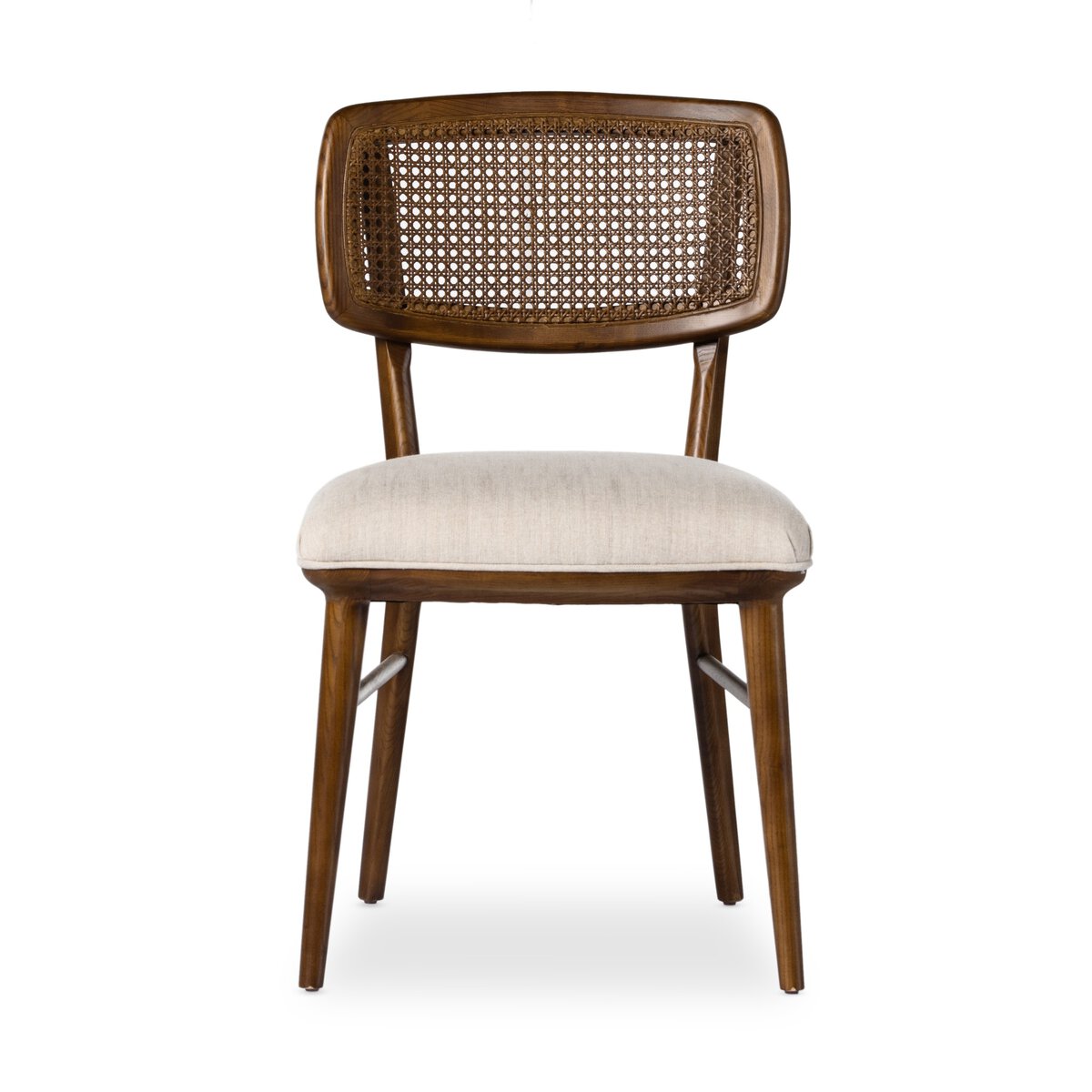 Finished in a deep almond, solid nettlewood forms a tapered frame for a cane back and off-white seating of high-performance fabric.