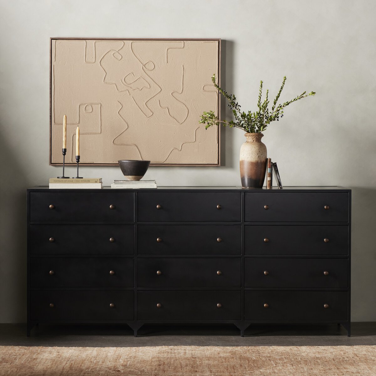 Industrial-inspired, black-finished iron forms a wide and roomy twelve-drawer dresser, with bronzed knobs for contrast. This item has been modified to comply with the STURDY Act. See a full list of modified products and data changes in the “STURDY Act” file in the Downloads section below.