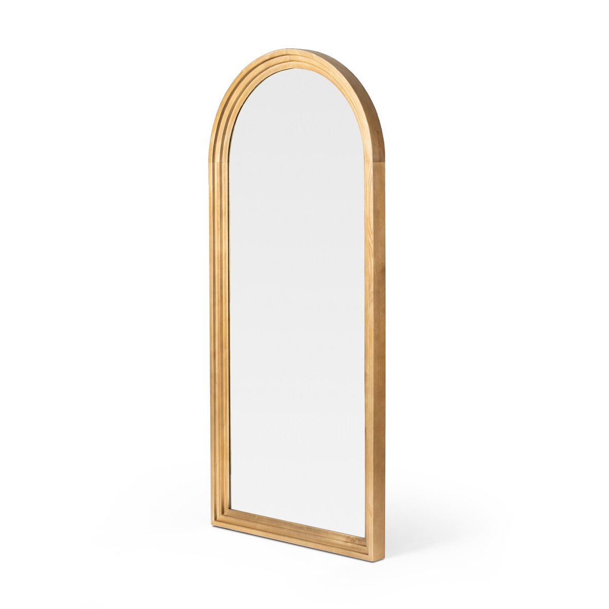 A modernized take on classic Art Deco elements. Arched natural nettlewood frames this floor mirror, finding detail in two inset terraces that step inward toward the mirror for a sense of depth.