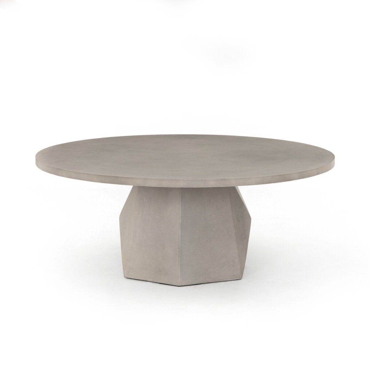 White-finished concrete forms a faceted base for impact from every angle. A roomy, rounded top is ready to welcome guests indoors or out. Cover or store inside during inclement weather and when not in use. Our Weatherproof Outdoor Round Coffee Table Cover in size medium fits this table.