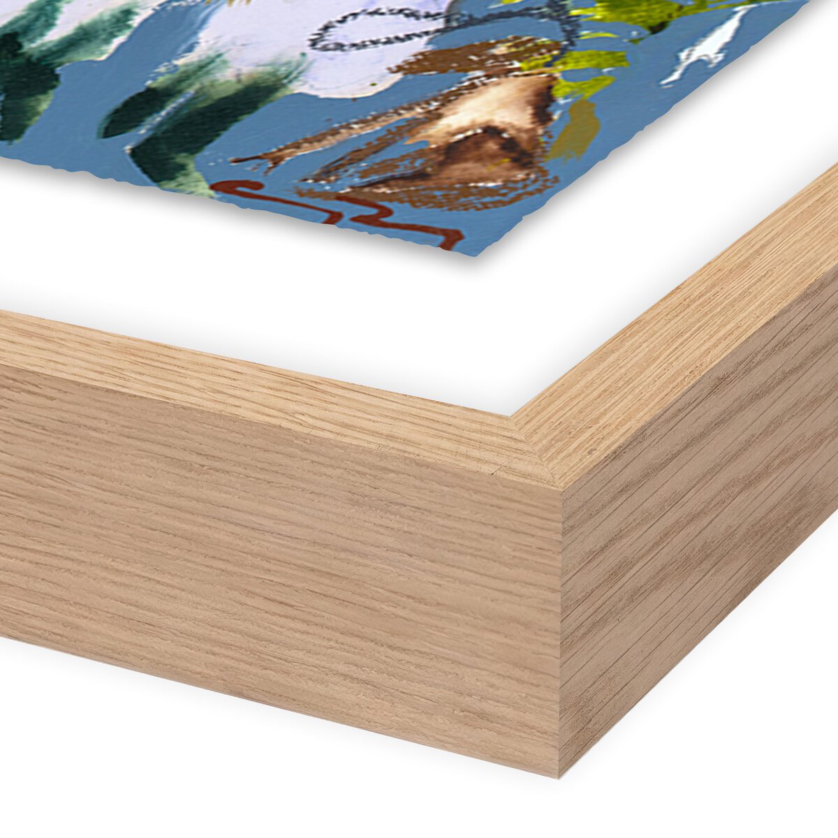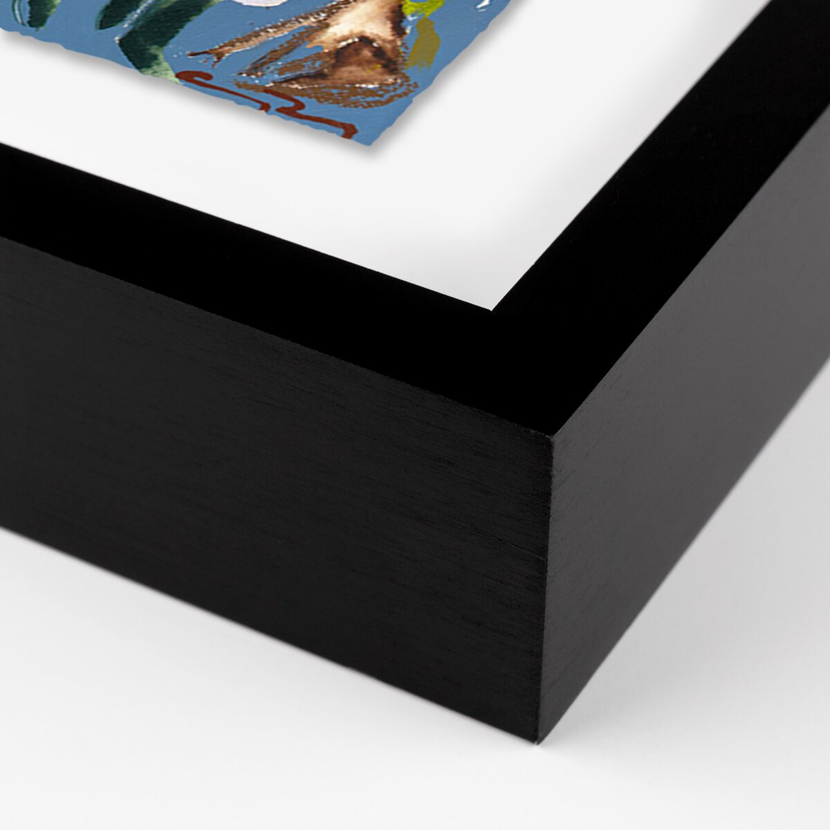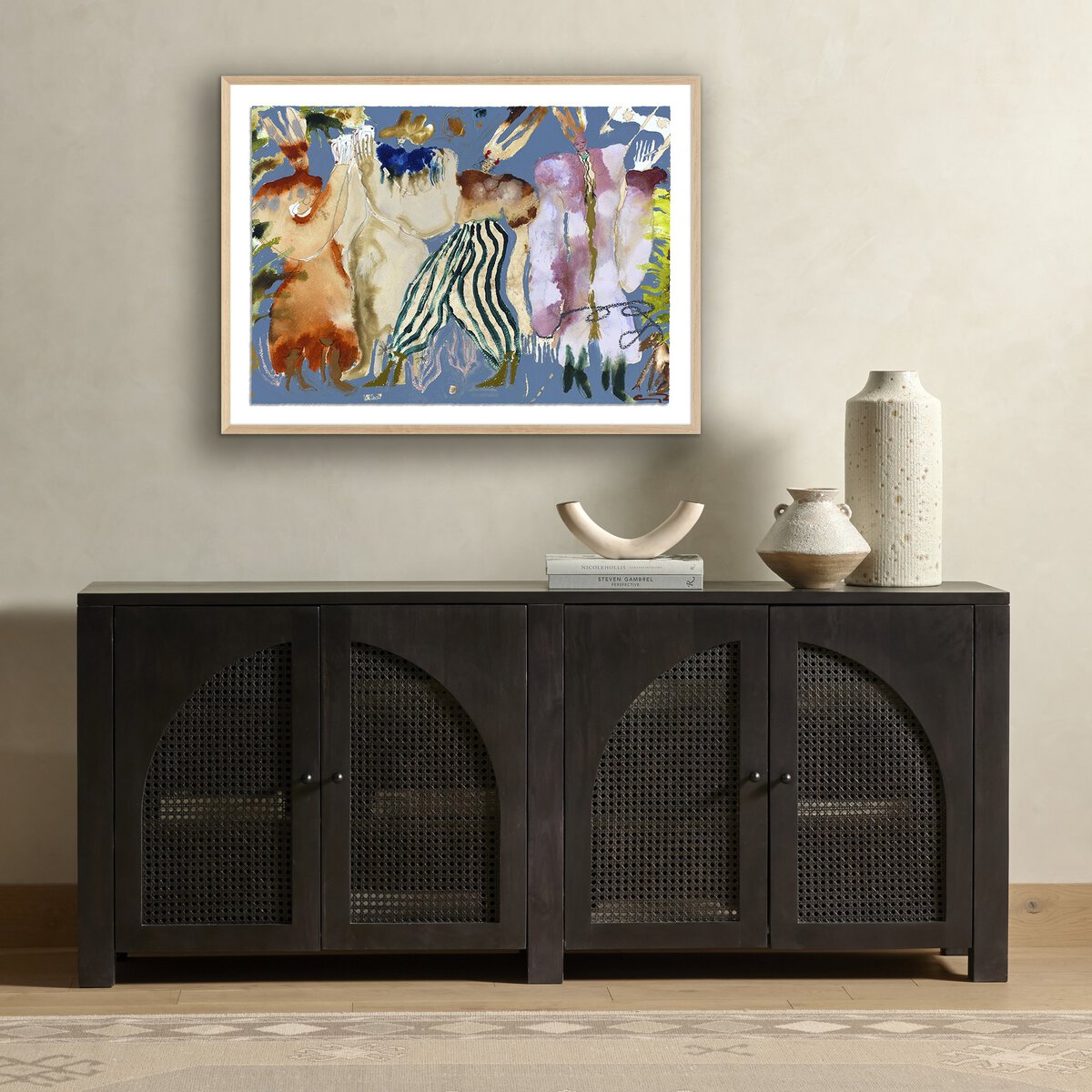 Austin figurative painter Caroline Pinney explores intimacy and human relationships in her art brut-evocative pieces. Working with a range of mediums, from oil stick and charcoal to coffee and spray paint, she often uses her own hand to manipulate materials. Printed on premium paper and float-mounted within a white-finished maple frame. Handmade in Austin, Texas.