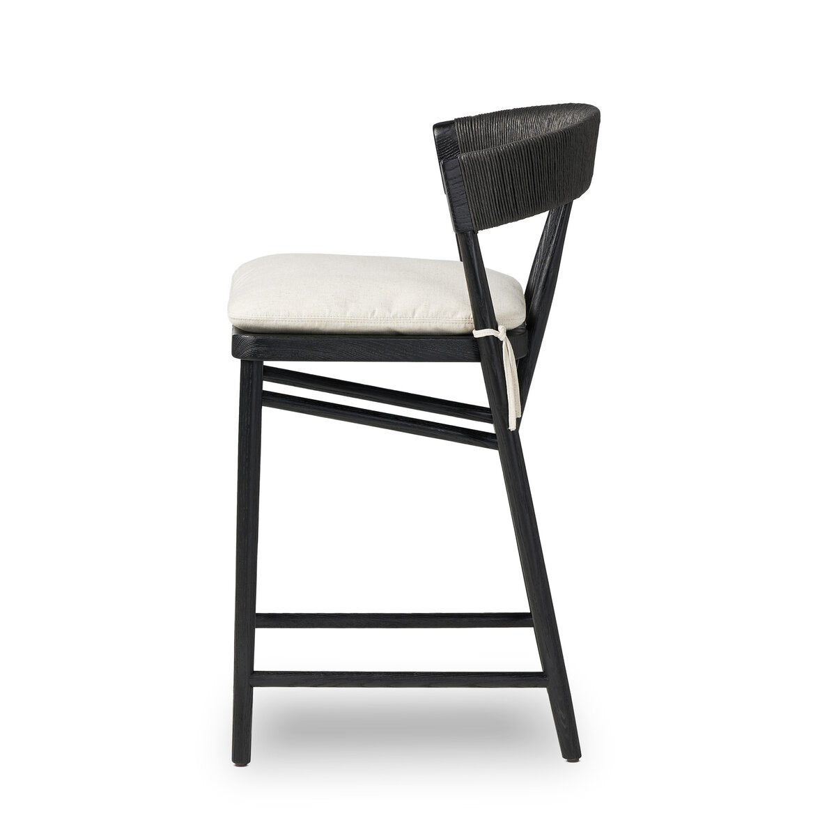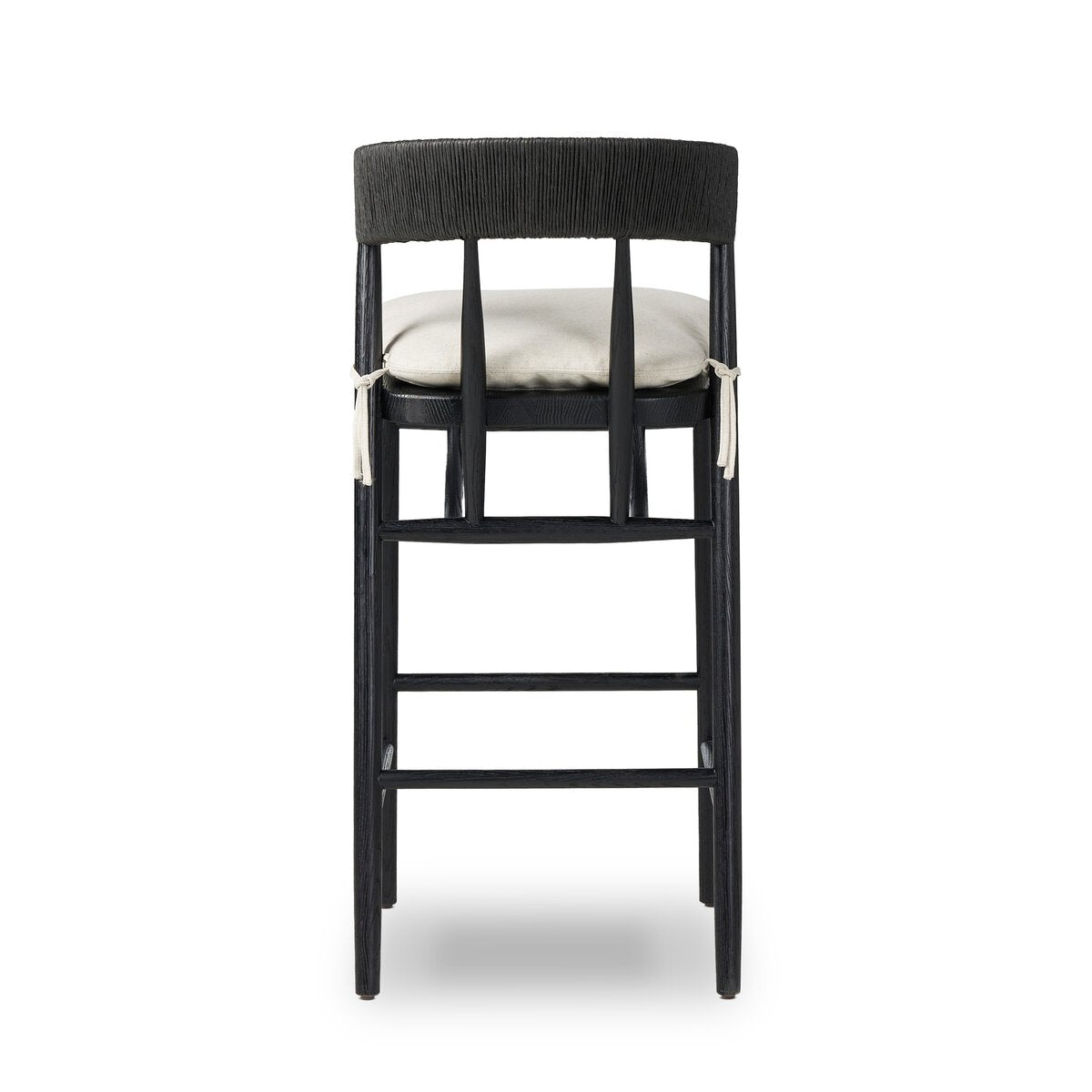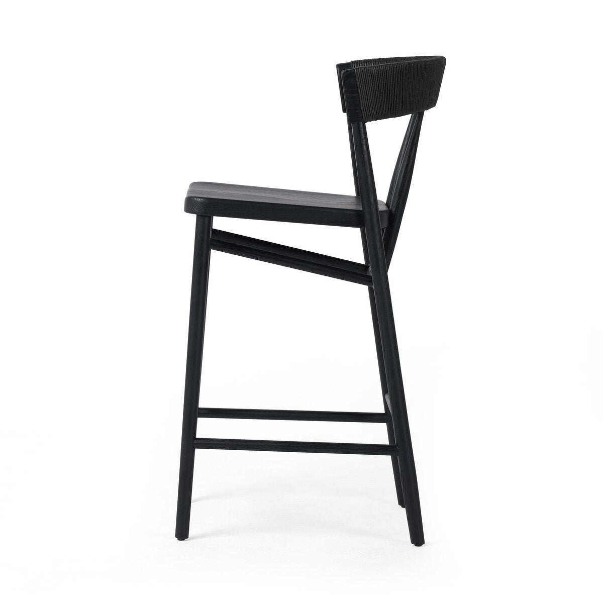 A solid oak bar stool defined by tapered legs and framing gives an updated look to the classic whistler chair. Finished with a paper rush wrapped detail on the back.