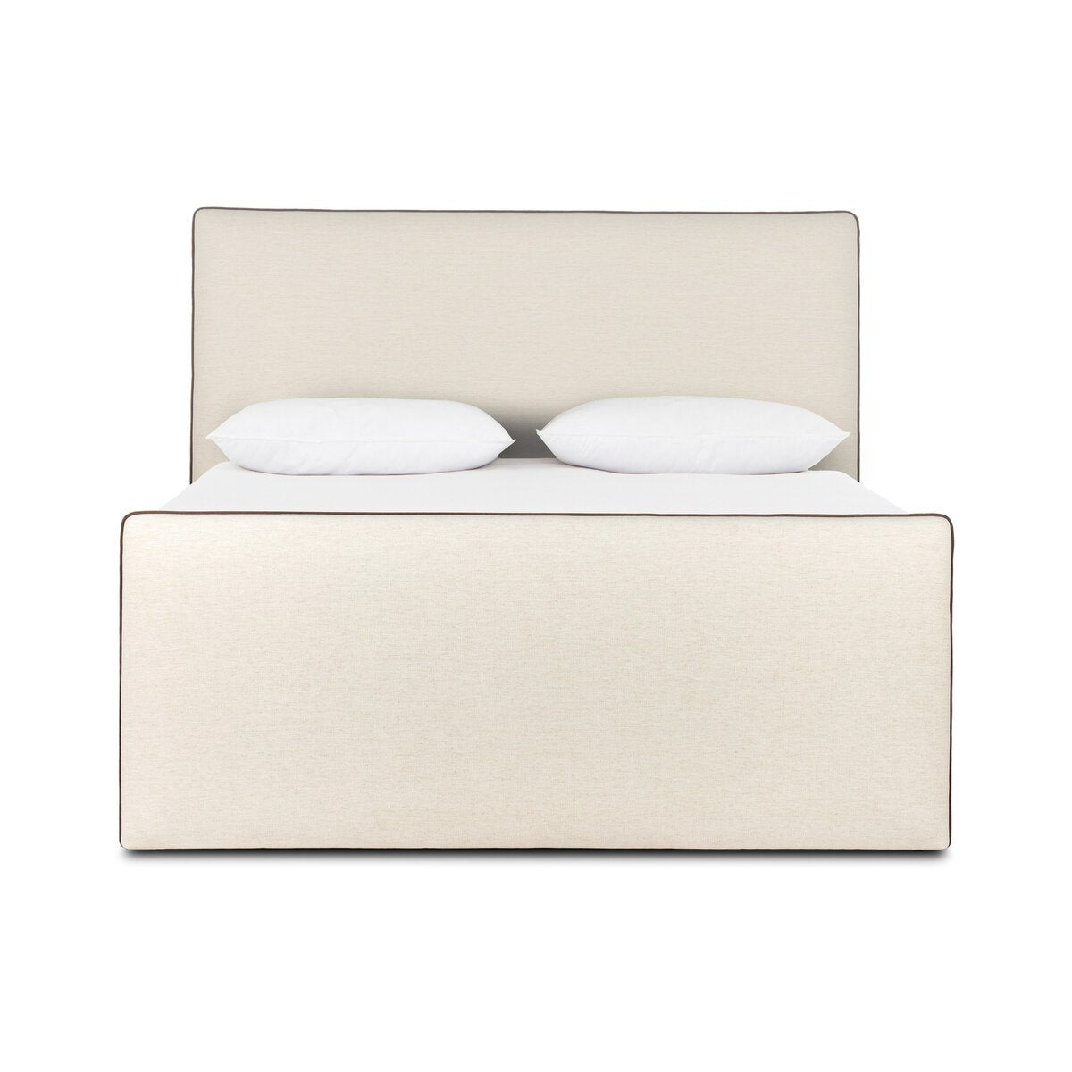 Overall Dimensions 73.00"w x 89.75"d x 54.00"hItem Number 249201-001Colors Crypton Nomad Snow, Crypton Nomad MushroomMaterials 92% Polyester, 8% Flax/LinenFabric PerformanceWeight 274.91 lbVolume 26.20 cu ftClearance from Side Rails 7.00"Distance between Slats 3.50"Floor to Top of Slat Height 14.25"Footboard Height 29.50"Footboard Thickness 5.50"Footboard Width 73.00"Headboard Height 54.00"Headboard Thickness 5.50"Headboard Width 73.00"Interior Dimension for Mattress Depth 81.00"Interior Dimension for Mattress Height 2.00"Interior Dimension for Mattress Width 61.00"Interior Frame Depth (Without Slats and Center Rail) 81.00"Interior Frame Width (Without Slats and Center Rail) 57.00"Side Rails Height 13.00"Side Rails Length 81.00"Side Rails Thickness 3.75"Adjustable Bed Frame Compatible YesBed Backing Dark FabricBed Material UpholsteredBox Spring Required Not RequiredCleaning Code