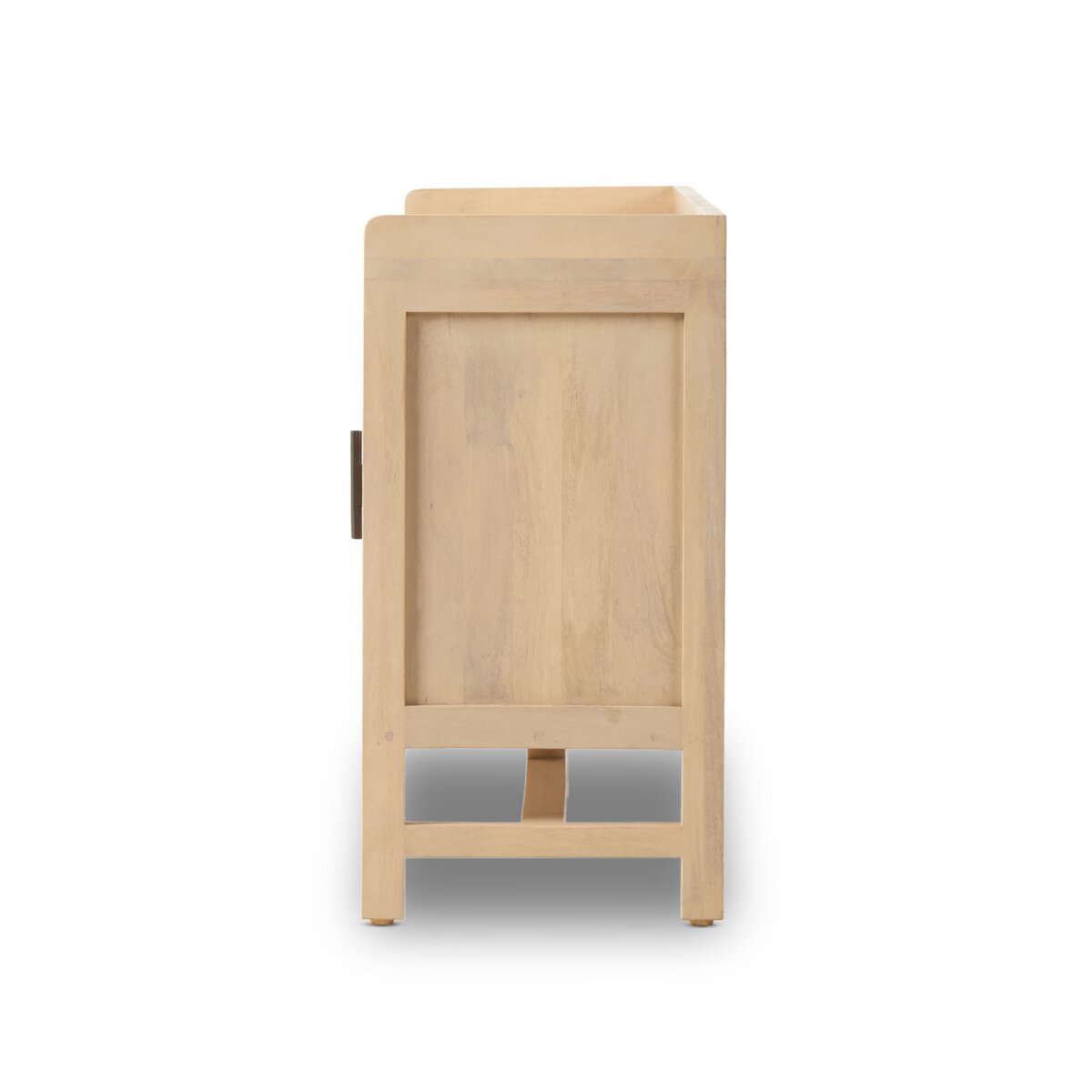 Monochromatic with a textural twist. Natural mango frames woven cane fronts, with black iron hardware for subtle contrast. Inside, spacious shelving and drawer space awaits storage of dinnerware and more.