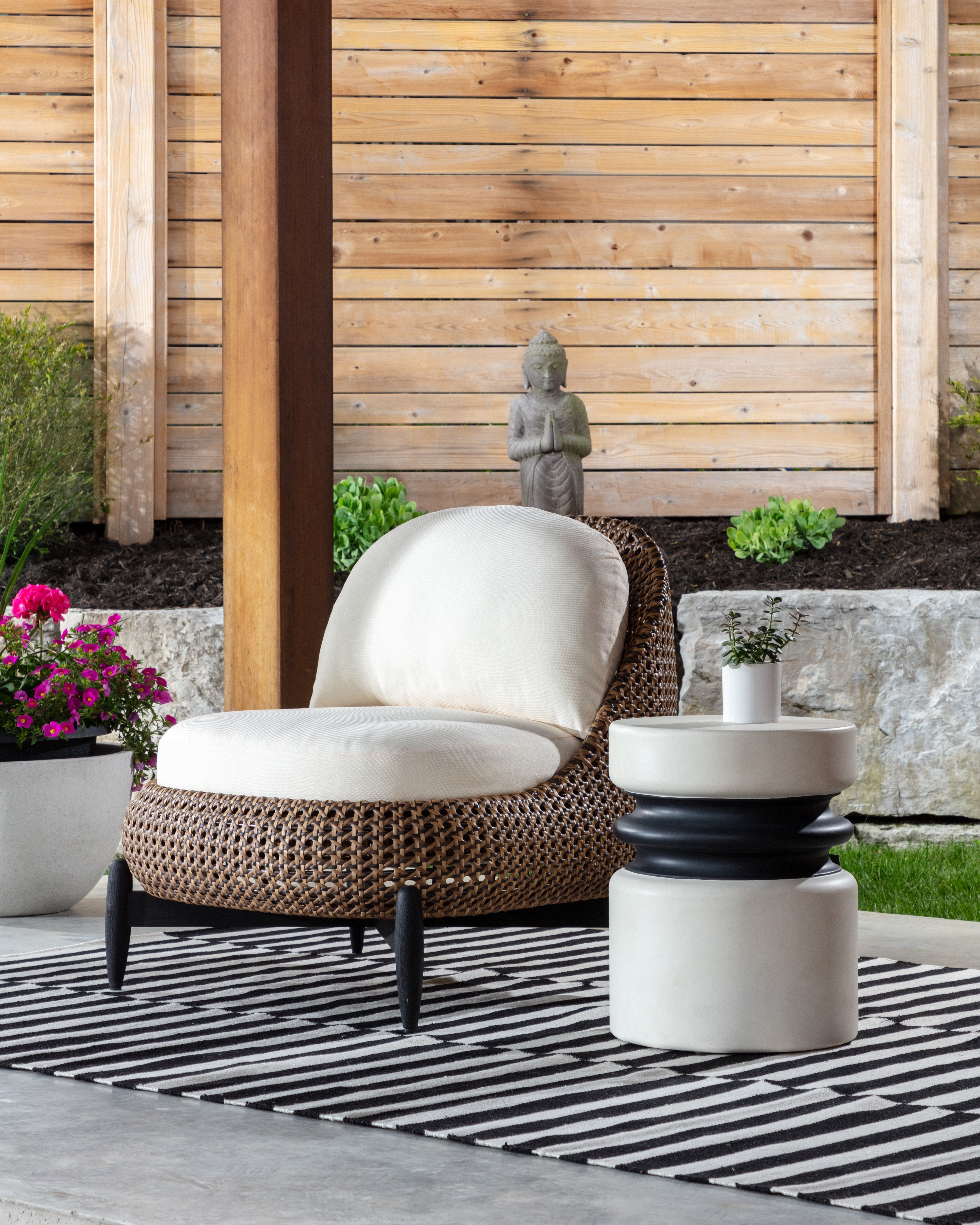 Synthetic all-weather wicker weave is fade resistant and easy to clean.