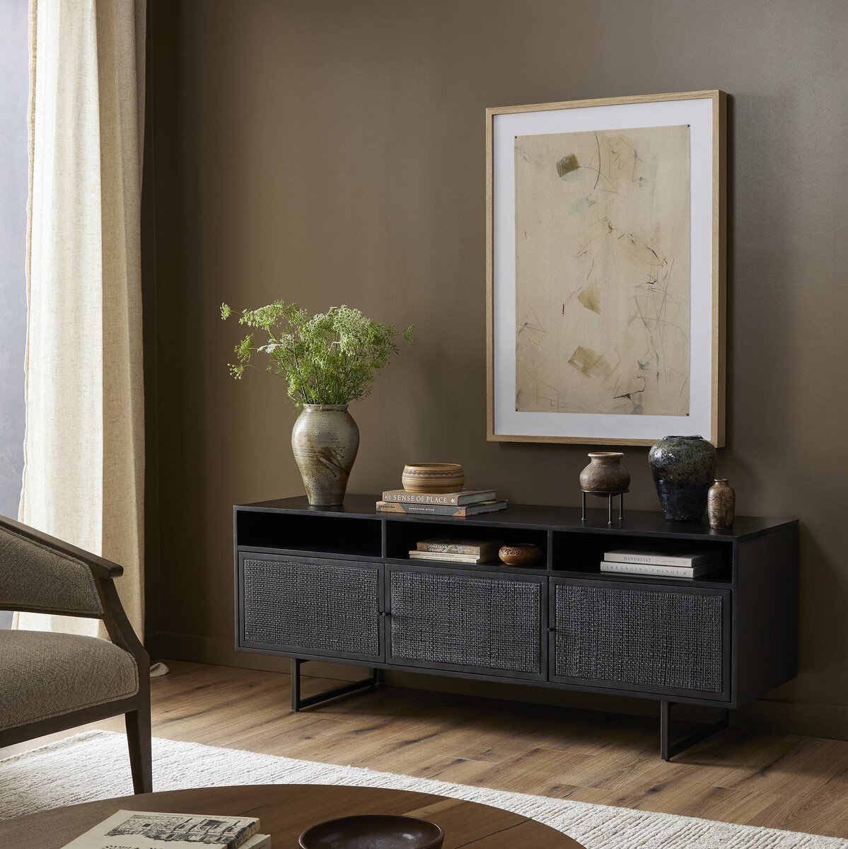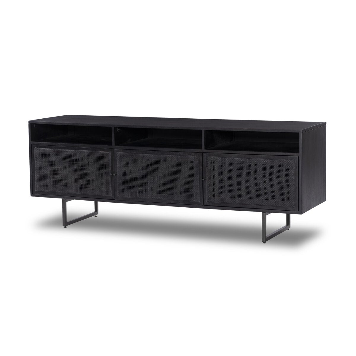 Overall Dimensions 65.00"w x 18.00"d x 24.00"hItem Number 106682-005Colors Brown Wash, Brown Cane, Charcoal GreyMaterials Solid Mango, Cane, IronWeight 101.39 lbVolume 18.19 cu ftClearance from Floor 1 6.50"Door Height 1 11.63"Door Thickness 1 1.00"Door Width 1 20.88"Interior Section Depth 1 16.50"Interior Section Depth 2 17.50"Interior Section Height 1 11.63"Interior Section Height 2 4.13"Interior Section Width 1 20.88"Interior Section Width 2 20.88"Cord Management YesDoor Closure Catch Type MagneticDoor Qty 3.00Door Type HingedDrawer Glide Type NoneDrawer Stop Material NoneFrame Construction Joinery Mortise and TenonFunctionality DoorsFunctionality ShelvesHas Leveler YesHinge Type Cabinetry-soft closeInterior Section Quantity 6.00Protective Feet Leg LevelersSuite Carmel