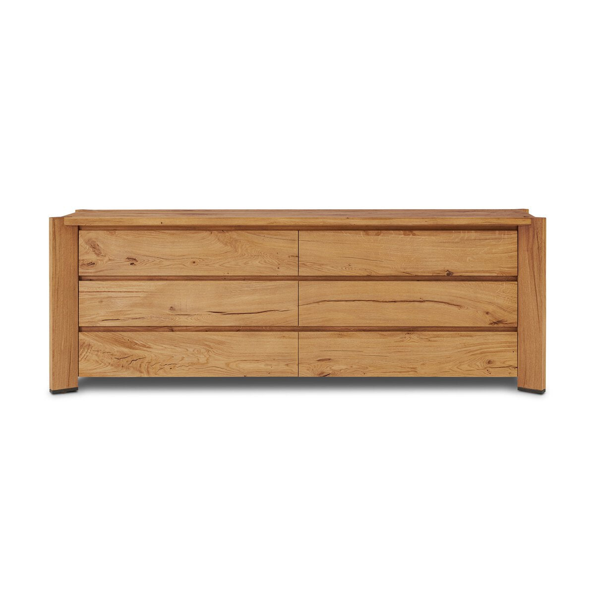 Overall Dimensions 88.50"w x 21.50"d x 31.50"hItem Number 242188-001Colors Natural Reclaimed French Oak, Dark BrassMaterials Solid Reclaimed Oak, BrassWeight 281.97 lbVolume 52.23 cu ftClearance from Floor 1 2.24"Drawer Depth 1 12.80"Drawer Height 1 5.39"Drawer Width 1 37.32"Door Type No DoorsDrawer Glide Color SilverDrawer Glide Type Sidemount MetalDrawer Joinery French DovetailDrawer Quantity 6.00Drawer Stop Anti Tip Rail YesDrawer Stop Material MetalFrame Construction Joinery Butt JointFrame Construction Joinery Corner-block/CleatFunctionality DrawersHas Leveler YesHas Soft Close Drawers YesProtective Feet Leg LevelersShape Type WideSuite CassioWeight Capacity 200 lb