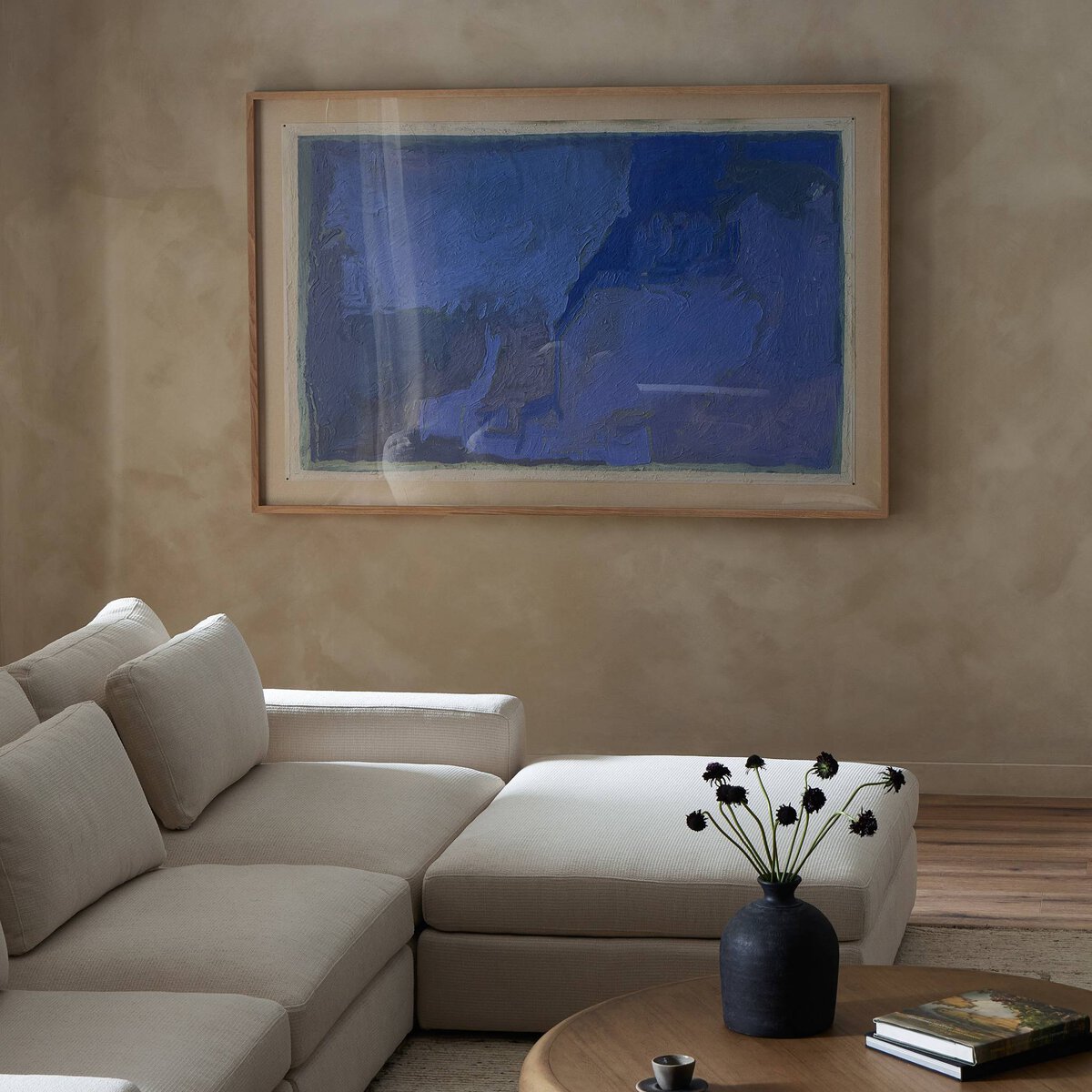 Overall Dimensions 40.00"w x 2.50"d x 28.00"hItem Number 245007-002Colors Vertical Grain 2.5 White Oak, Matte Canvas, FlaxMaterials Vertical Grain White Oak, Matte Canvas, Linen BackerWeight 20.00 lbVolume 3.88 cu ftArtist Tyler GuinnMain Color BlueOrientation HorizontalPresentation Style Canvas FramedSize LargeSubject AbstractSuite Caught in the Wake