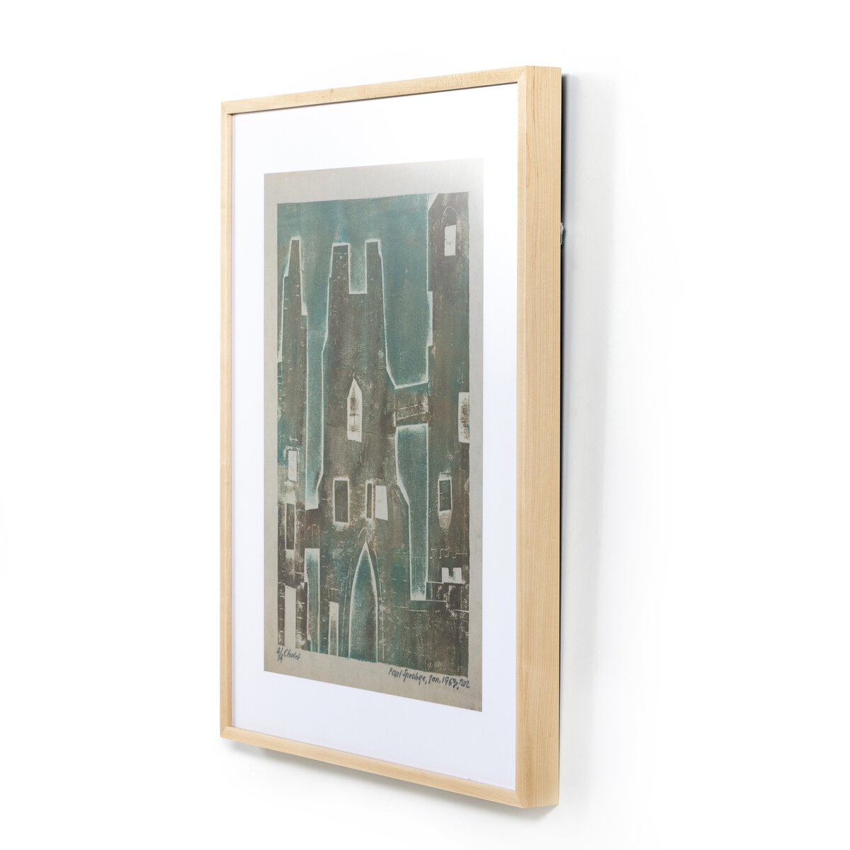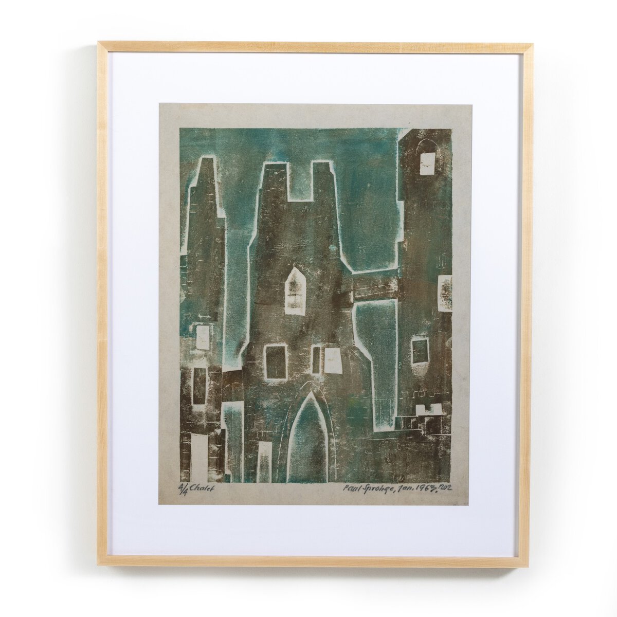 A Latvian native with a Doctorate in Architecture, the late Pepi Sprohge worked in a range of mediums, from paper lithographs to marker drawings. A vintage piece of his from 1963 is given new life, and signed, dated and titled by the artist. Framed within natural-finished American maple for a gallery-quality look. Handmade in Austin, Texas.