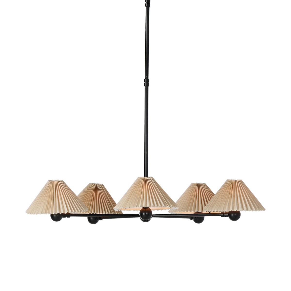 Overall Dimensions 41.00"w x 41.00"d x 7.00"hItem Number 239977-001Colors Jet Black, Black CordMaterials Iron, ThermoplasticWeight 13.67 lbVolume 9.68 cu ftAdjustable Light, Overall Height (Max) 77.00"Adjustable Light, Overall Height (Min) 11.00"Chandelier Body Depth 41.00"Chandelier Body Height 7.00"Chandelier Body Width 41.00"Cord Length 120.00"Mounting Plate Diameter 5.00"Mounting Plate Height 1.00"Pipe Length 1 18.00"Pipe Length 2 12.00"Pipe Length 3 6.00"Shade Bottom Diameter 10.00"Shade Height 1 5.25"Shade Top Diameter 1 1.25"Adjustable YesBathroom Safe NoBulb Type LEDCan Hang On Sloped Ceiling YesCord Type SPT-2Environmental Rating Dry RatedMax Wattage 4.50Pipe Length Qty  2(12'') Pipe Length Qty  2(6'')Pipe Length Qty 2 (18'') Plug Type HardwiredShade Shape TaperedShape Type RoundSocket Qty 5.00Socket Type  E12: SOCKETSocket Type TYPE BSuite ClydeSwitch Type HARDWIRED (NO SWITCH)