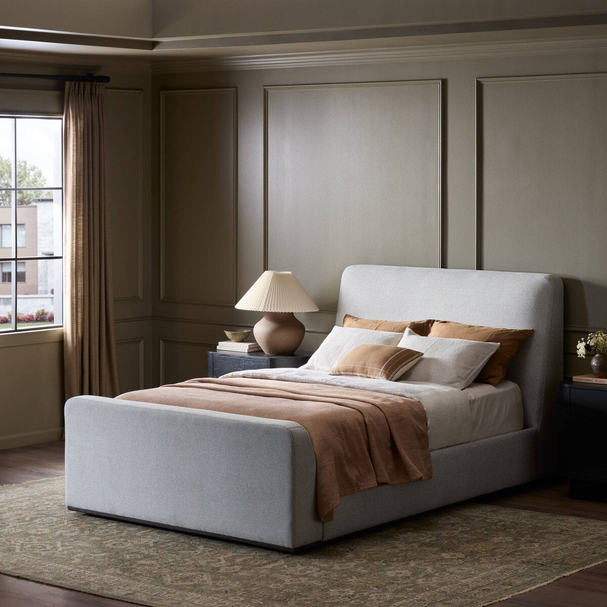Overall Dimensions 81.50"w x 103.00"d x 49.50"hItem Number 246565-004Colors Irving Flax, Aged SiennaMaterials 56% Polyester, 44% Acrylic, Solid Rosa MoradaFabric PerformanceWeight 298.50 lbVolume 63.95 cu ftClearance from Footboard 2.00"Clearance from Headboard 2.00"Clearance from Side Rails 2.00"Distance between Slats 3.50"Floor to Top of Slat Height 11.50"Footboard Height 25.50"Footboard Thickness 9.50"Footboard Width 81.50"Headboard Height 49.50"Headboard Thickness 12.50"Headboard Width 81.50"Interior Dimension for Mattress Depth 81.00"Interior Dimension for Mattress Height 2.00"Interior Dimension for Mattress Width 77.00"Interior Frame Depth (Without Slats and Center Rail) 81.00"Interior Frame Width (Without Slats and Center Rail) 77.00"Side Rails Height 12.00"Side Rails Length 81.00"Side Rails Thickness 2.50"Adjustable Bed Frame Compatible YesBed Backing Fully Upholstered (In selected Colored Material)Bed Material UpholsteredBox Spring Required Not RequiredCleaning Code
