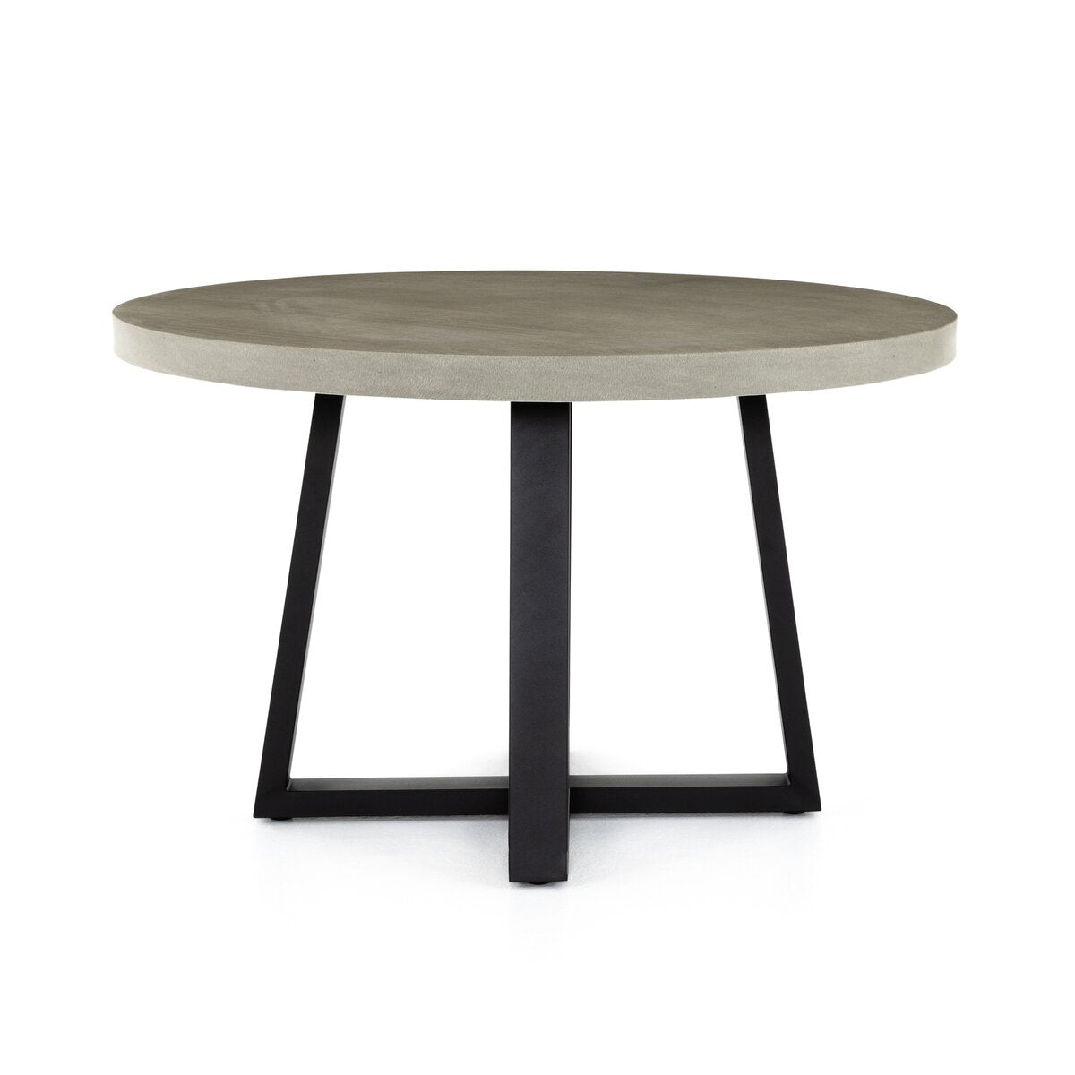 A strikingly simple poly-resin top derived from river sand is polished to a smooth sheen in a neutral oatmeal hue. An angled, off-white iron base adds architectural appeal to this outdoor-friendly dining table. Slight color variance is to be expected, and speaks to lava stone's organic nature. Cover or store indoors during inclement weather and when not in use.