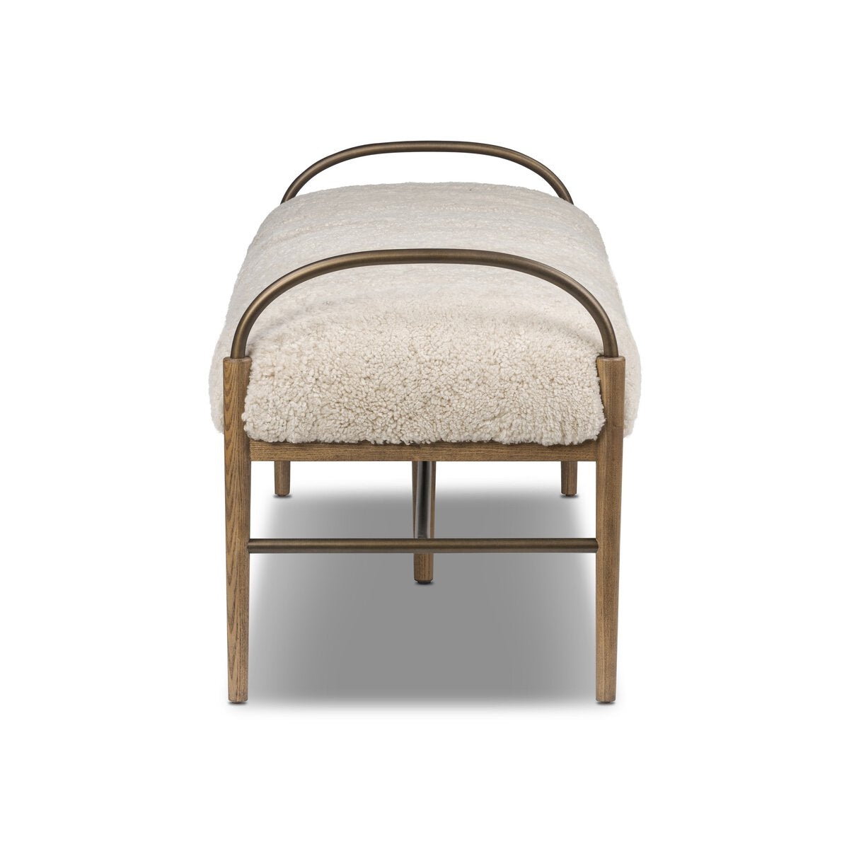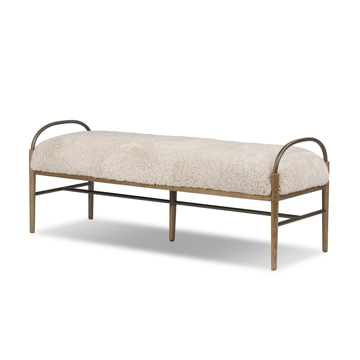 Overall Dimensions 76.00"w x 20.00"d x 23.25"hItem Number 244103-005Colors Beige Shearling, Amber Ash, Brushed BrassMaterials Shearling, Solid Ash, IronWeight 57.32 lbVolume 29.63 cu ftClearance from Floor 1 7.78"Distance between Legs (Front to Back) 1 17.48"Distance between Legs (Side to Side) 1 73.46"Seat Depth 1 20.00"Seat Height 1 20.00"Seat Width 1 74.49"Chair Arm Option ArmlessCleaning Code