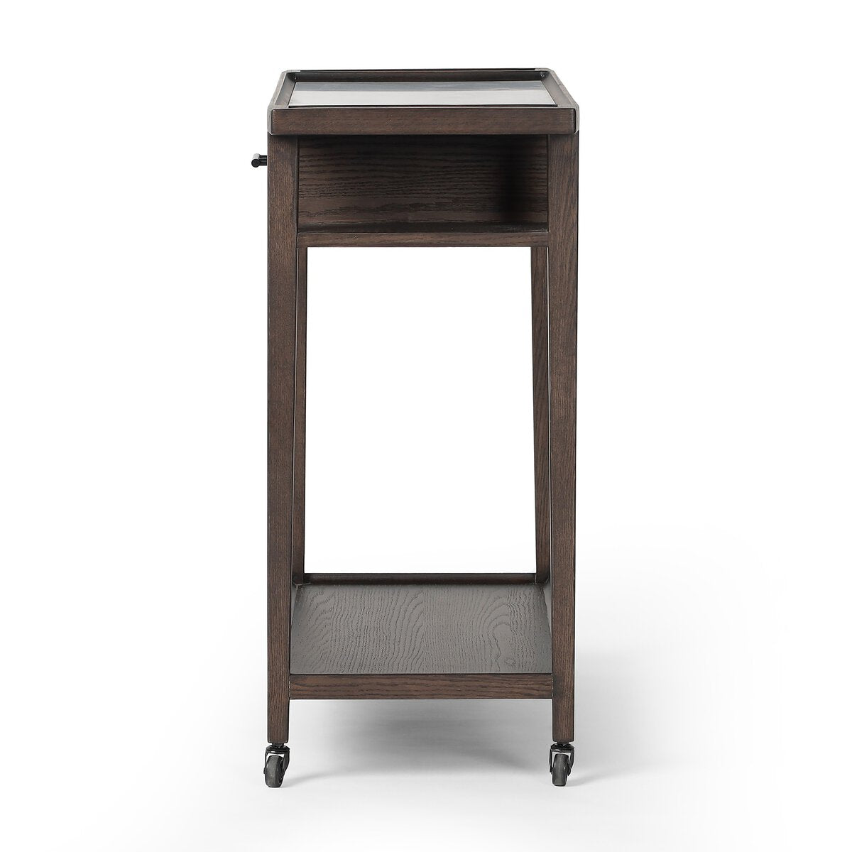 Overall Dimensions 39.00"w x 15.00"d x 33.00"hItem Number 245352-001Colors Brown Oak, Honed White Marble, Smooth Black MetalMaterials Solid Oak, Solid Marble, AluminumWeight 51.37 lbVolume 16.35 cu ftClearance from Floor 1 4.50"Drawer Depth 1 11.50"Drawer Height 1 3.00"Drawer Width 1 17.00"Fixed Shelf Depth 1 13.50"Fixed Shelf Depth 2 15.00"Fixed Shelf Height 1 1.25"Fixed Shelf Height 2 0.75"Fixed Shelf Width 1 31.50"Fixed Shelf Width 2 4.63"Interior Section Depth 1 13.50"Interior Section Depth 2 15.00"Interior Section Depth 3 15.00"Interior Section Height 1 20.50"Interior Section Height 2 4.75"Interior Section Height 3 4.75"Interior Section Width 1 31.50"Interior Section Width 2 4.63"Interior Section Width 3 4.63"Casters 360-degree spinDoor Type No DoorsDrawer Glide Color BlackDrawer Glide Type Sidemount MetalDrawer Quantity 1.00Drawer Stop Material NoneFixed Shelf Qty 2.00Fixed Shelves YesFrame Construction Joinery Mortise and TenonFunctionality CastersFunctionality DrawersFunctionality ShelvesInterior Section Quantity 3.00Recommended Shelf Capacity (kg) 18.14Recommended Shelf Capacity (lbs) 40.00Shape Type CartSuite DorritWeight Capacity 100 lb