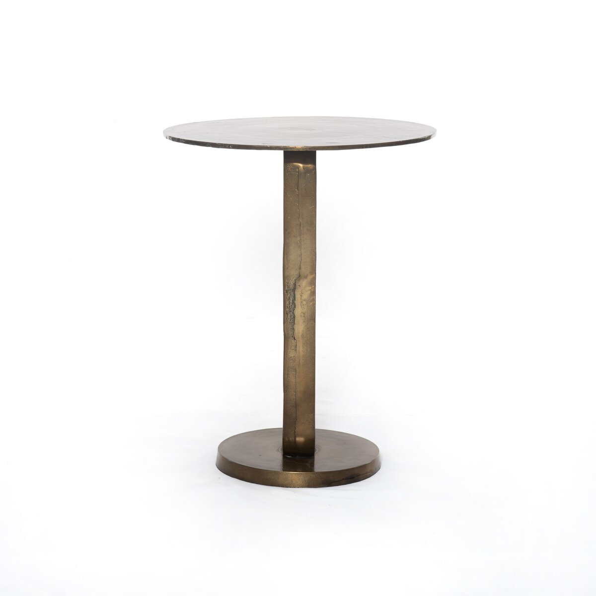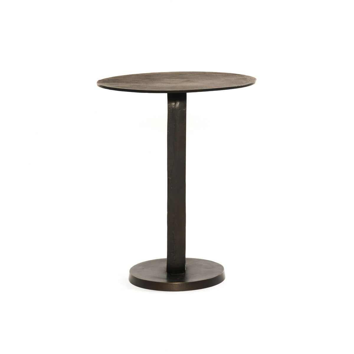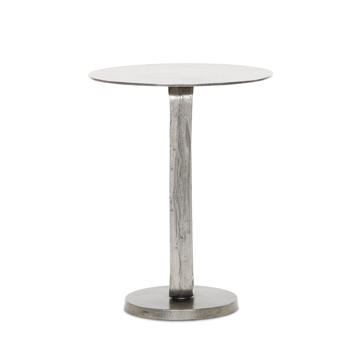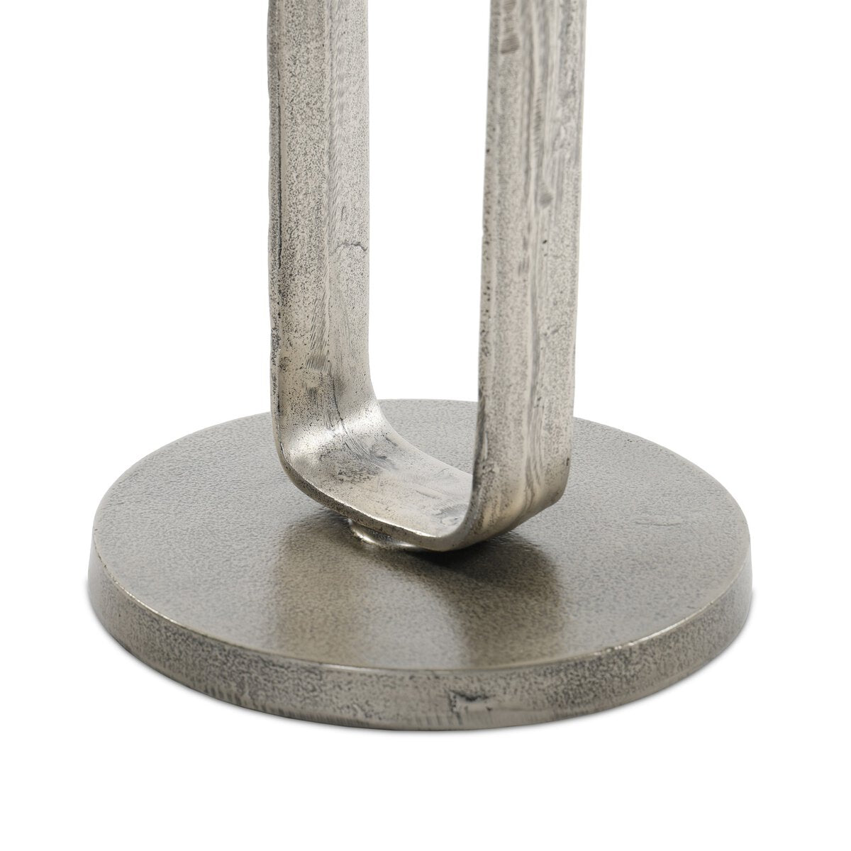 The rounded base and tabletop of raw antique nickel aluminum are connected via a shapely ring for an open look and fun blend of scale and proportion. Safe for outdoor spaces. Cover or store indoors during inclement weather and when not in use.