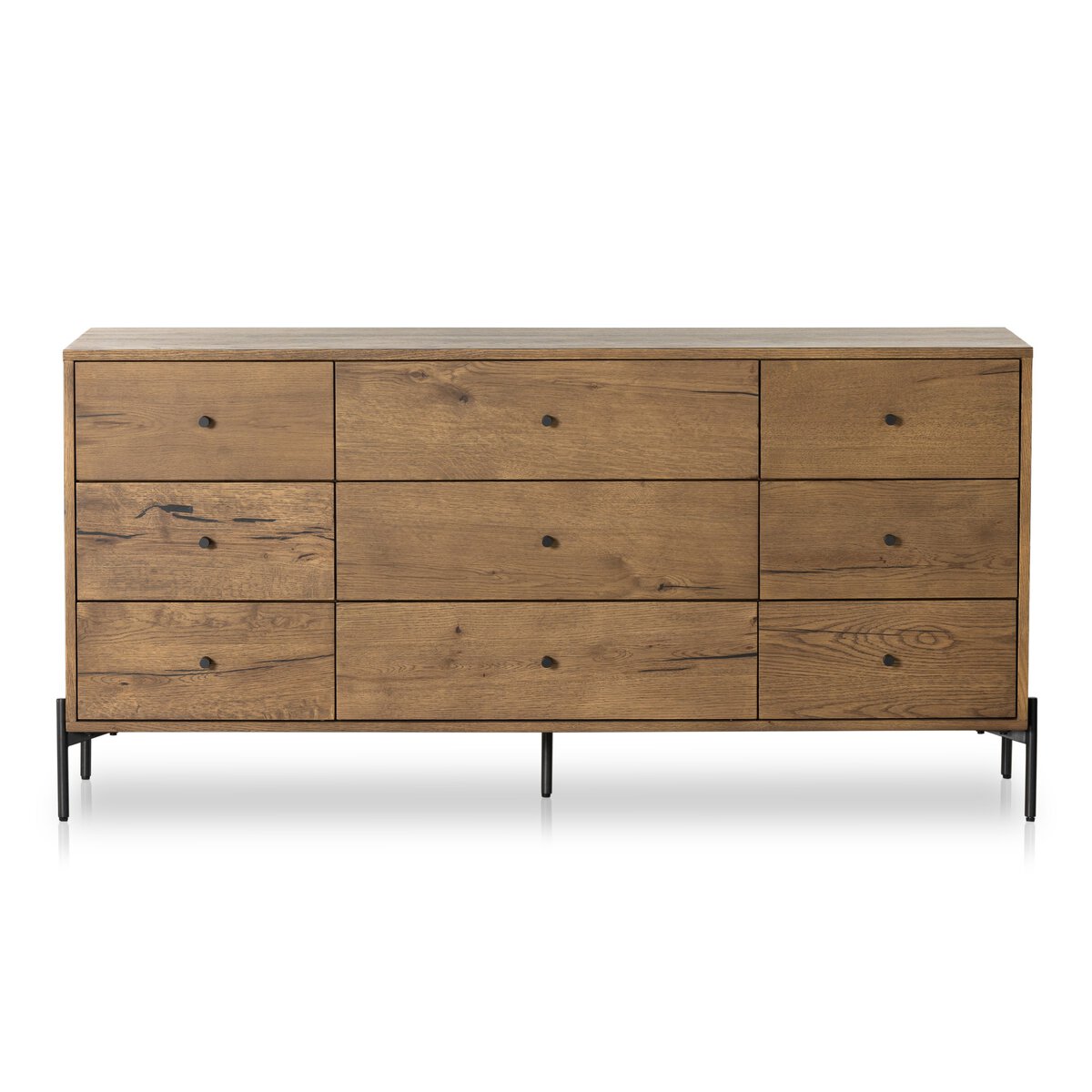 Overall Dimensions 65.50"w x 20.50"d x 31.50"hItem Number 109283-002Colors Amber Oak Resin, Dark GunmetalMaterials Thick Oak Veneer, IronWeight 200.62 lbVolume 30.12 cu ftClearance from Floor 1 6.02"Drawer Depth 1 14.41"Drawer Depth 2 14.41"Drawer Height 1 5.28"Drawer Height 2 5.28"Drawer Width 1 15.20"Drawer Width 2 25.75"Door Type No DoorsDrawer Glide Color SilverDrawer Glide Type Undermount MetalDrawer Joinery English DovetailDrawer Quantity 9.00Drawer Stop Material NoneFrame Construction Joinery Butt JointFunctionality DrawersHas Leveler YesHas Soft Close Drawers YesProtective Feet Leg LevelersShape Type WideSuite EatonWeight Capacity 100 lb