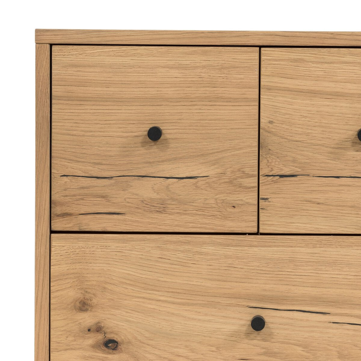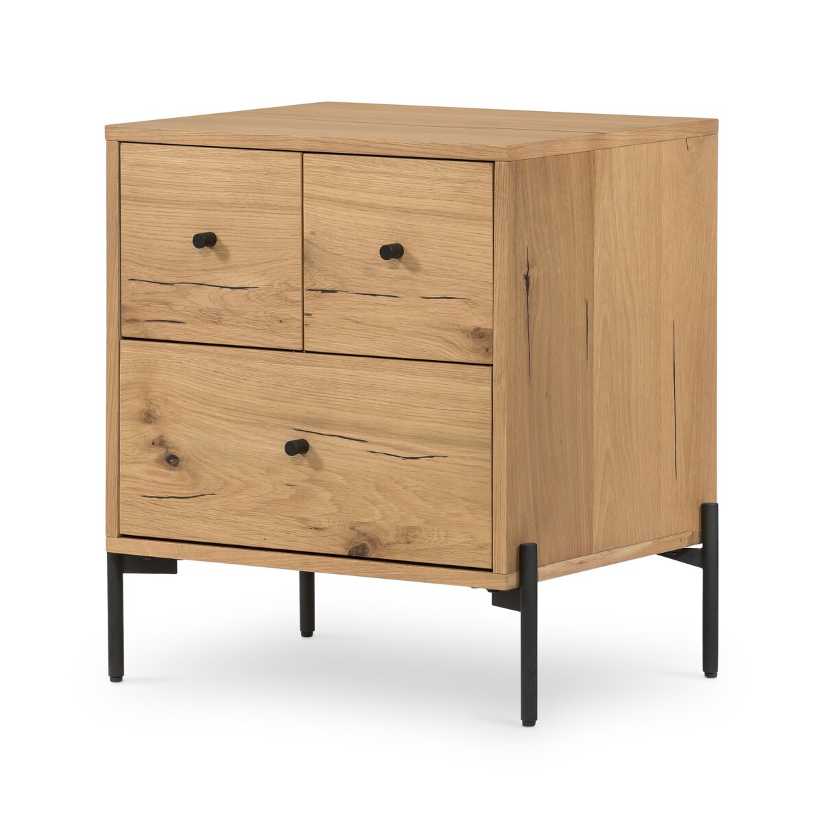 Overall Dimensions 23.50"w x 18.50"d x 26.00"hItem Number 109286-003Colors Light Oak Resin, Dark GunmetalMaterials Thick Oak Veneer, IronWeight 62.83 lbVolume 8.76 cu ftClearance from Floor 1 6.02"Drawer Depth 1 12.80"Drawer Depth 2 12.80"Drawer Height 1 6.06"Drawer Height 2 6.06"Drawer Width 1 18.86"Drawer Width 2 8.27"Door Type No DoorsDrawer Glide Color SilverDrawer Glide Type Undermount MetalDrawer Joinery English DovetailDrawer Quantity 3.00Drawer Stop Material NoneFrame Construction Joinery Butt JointFunctionality DrawersHas Soft Close Drawers YesProtective Feet Leg LevelersShape Type RectangleSuite EatonWeight Capacity 100 lb