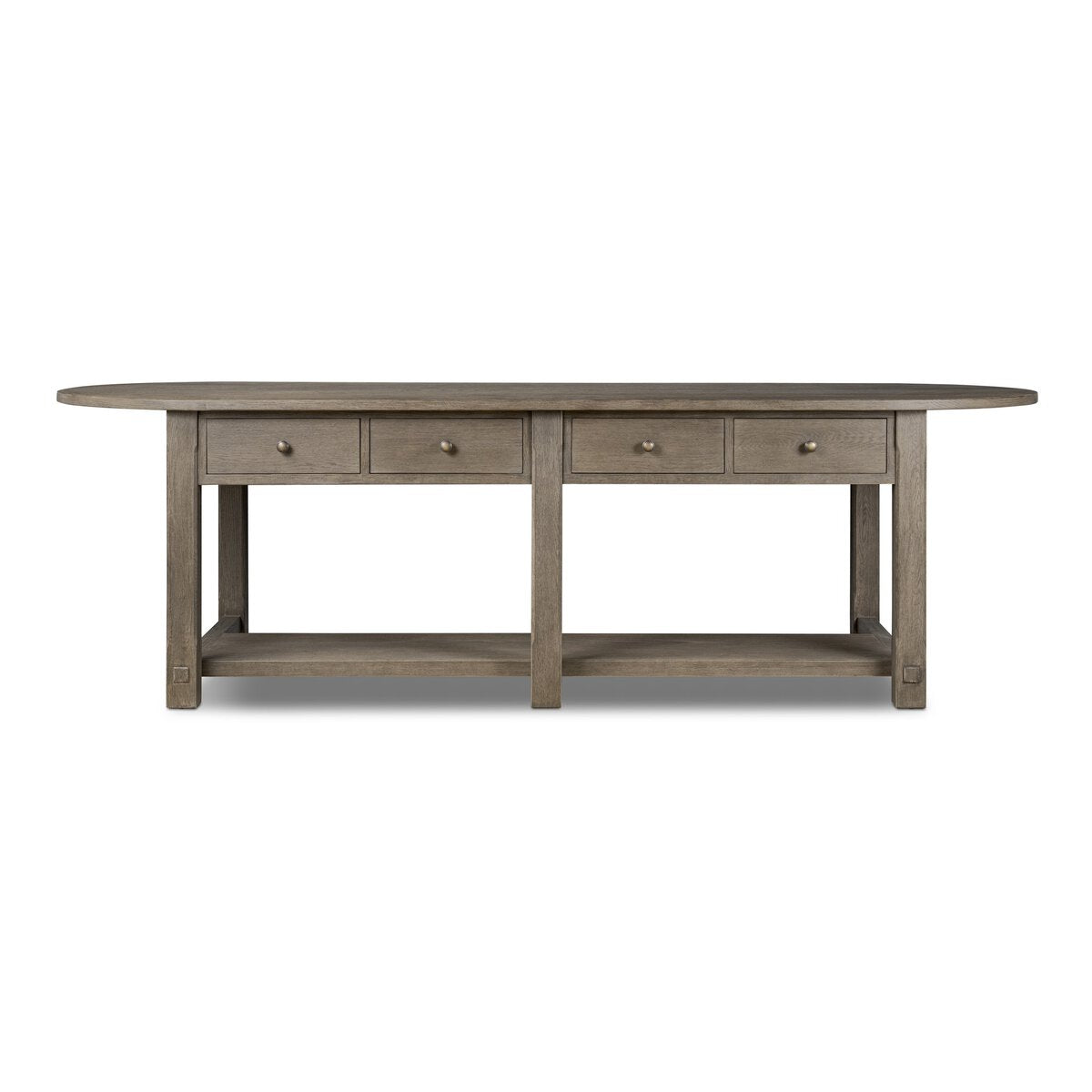 Overall Dimensions 120.00"w x 43.00"d x 36.00"hItem Number 244069-002Colors Weathered Hazel Oak Veneer, Dark BrassMaterials Oak Veneer, BrassWeight 346.12 lbVolume 80.91 cu ftClearance from Floor 1 2.99"Distance between Legs (Front to Back) 1 31.97"Distance between Legs (Side to Side) 1 79.92"Drawer Depth 1 15.55"Drawer Height 1 4.65"Drawer Width 1 15.98"Fixed Shelf Depth 1 19.02"Fixed Shelf Height 1 1.97"Fixed Shelf Width 1 81.69"Interior Section Depth 1 19.02"Interior Section Height 1 21.02"Interior Section Width 1 81.69"Overhang Width 1 16.50"Door Type No DoorsDrawer Glide Color SilverDrawer Glide Type Undermount MetalDrawer Quantity 4.00Drawer Stop Material NoneFixed Shelf Qty 1.00Fixed Shelves YesFunctionality DrawersFunctionality ShelvesHas Leveler YesHas Soft Close Drawers YesInterior Section Quantity 1.00Protective Feet Leg LevelersRecommended Shelf Capacity (kg) 18.14Recommended Shelf Capacity (lbs) 40.00Seating Capacity 3.00Shape Type OvalSuite EliseWeight Capacity 200 lb