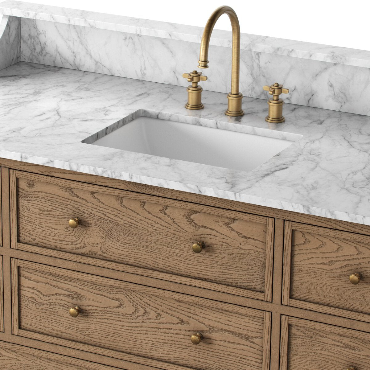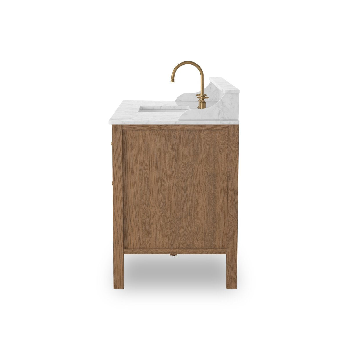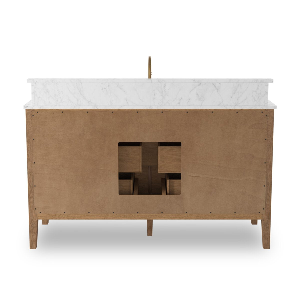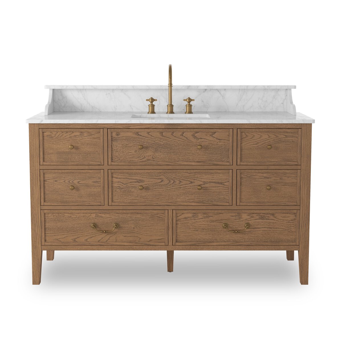 Overall Dimensions 56.00"w x 24.50"d x 38.50"hItem Number 244464-001Colors Satin Worn Oak Veneer, Carrara MarbleMaterials Oak Veneer, Solid Marble, Solid OakWeight 272.27 lbVolume 52.90 cu ftBacksplash Depth 2.99"Backsplash Height 5.79"Backsplash Width 54.02"Clearance from Floor 1 7.01"Countertop Depth 23.82"Countertop Thickness 0.71"Countertop Width 55.98"Distance from Edge to Sink (back) 7.87"Distance from Edge to Sink (front) 4.92"Distance from Edge to Sink (side) 20.12"Distance from Faucet Hole to Back Edge 4.41"Faucet Hole Diameter 1.42"Plumbing Cutout Height 12.01"Plumbing Cutout Width 14.02"Sink Depth 13.78"Sink Drain Diameter 1.77"Sink Height 8.07"Sink Interior Depth 11.02"Sink Interior Height 6.50"Sink Interior Width 15.75"Sink Width 18.50"Vanity Base Depth 24.02"Vanity Base Height 32.01"Vanity Base Width 54.96"Anti-Tip Kit Included? YesBasin Overflow YesDrain Placement MiddleDrawer Glide Type Undermount MetalDrawer Joinery English DovetailDrawer Quantity 8.00Drawer Stop Anti Tip Rail YesDrawer Stop Material MetalDrawer Types StandardFaucet Placement Style 8” spread with 3 pre-drilled cutoutsFrame Construction Joinery Corner-block/CleatFrame Construction Joinery Mortise and TenonFrame Construction Joinery Tongue and GrooveFunctionality DoorsFunctionality DrawersHas Backsplash YesHas Leveler YesHas Soft Close Drawers YesNum Of Functional Drawers 7.00Num Of Plumbing Cutouts 1.00Protective Feet Leg LevelersRecommended P-Trap Style StandardRemovable Back YesSink Shape RectangleSink Style UndermountSuite Elliston