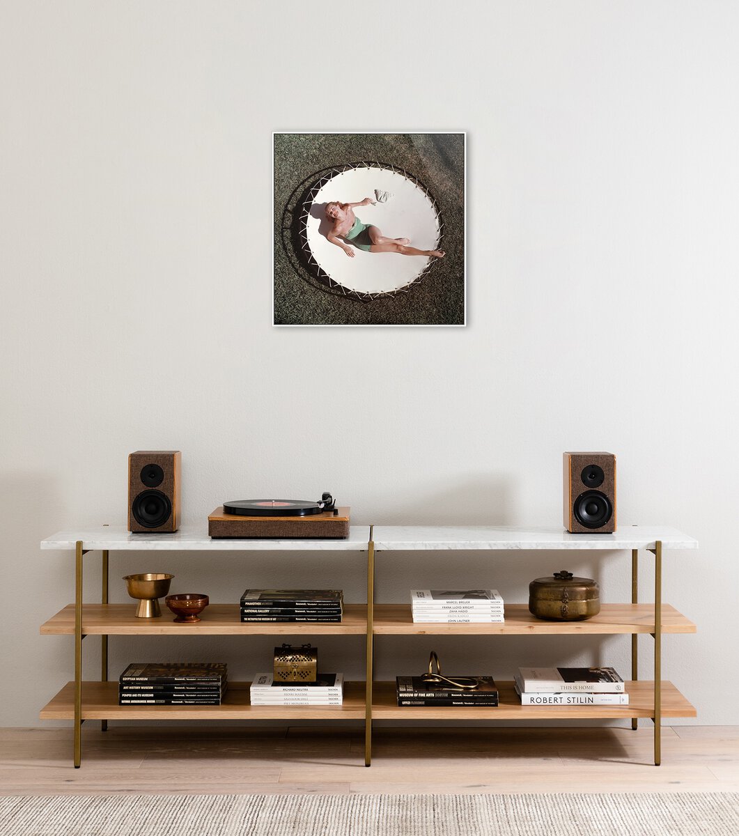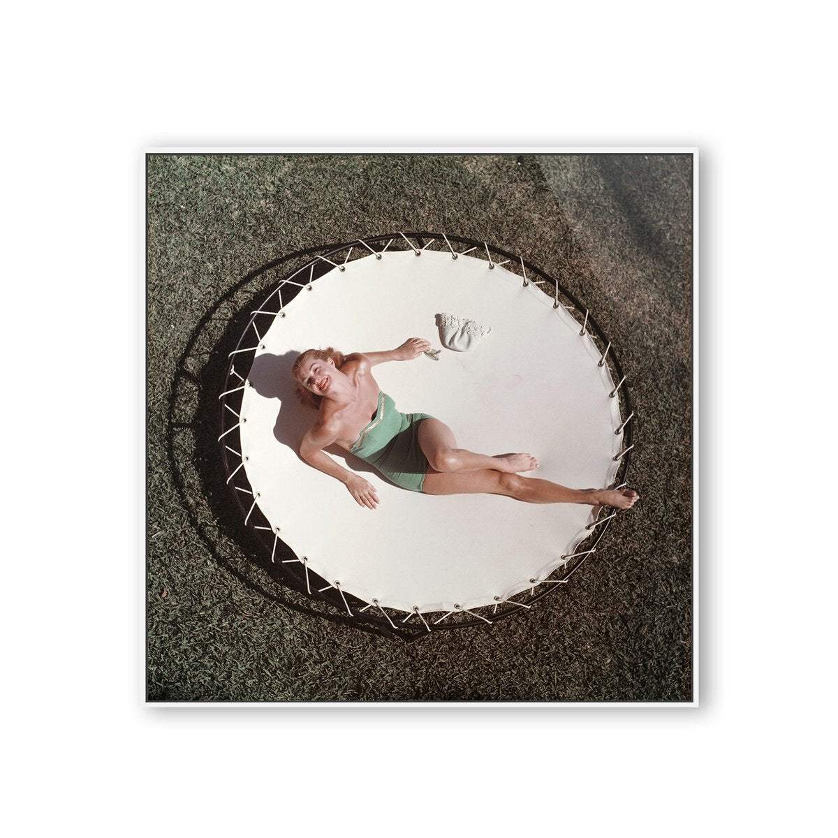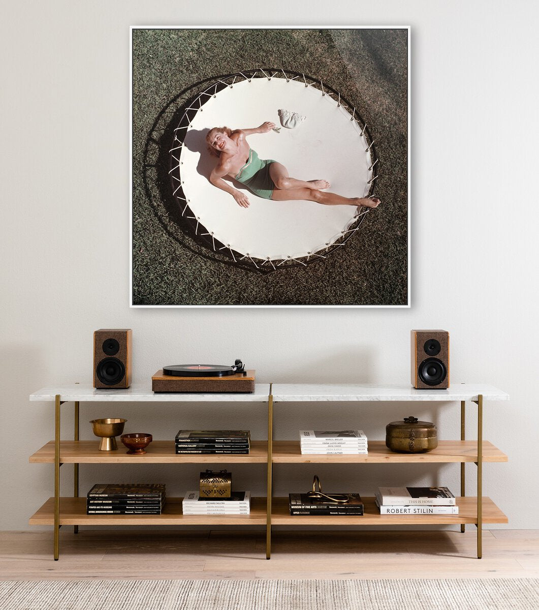 American swimmer and actress Esther Williams (1921 – 2013) lounging on a trampoline, circa 1956. This specially selected work from the late influential photographer Slim Aarons is printed using ultra-modern ChromaLuxe technology for the first time ever. High in definition and gloss, images are printed in vibrant, saturated color on fade- and scratch-resistant recycled aluminum. Each is float-mounted with hand-selected framing designed to complement the print. Handmade in Austin, Texas, each piece includes a certificate of authenticity commemorating the partnership between Slim Aarons, Getty Images Gallery and Four Hands Art Studio. Photo courtesy of Getty Images.