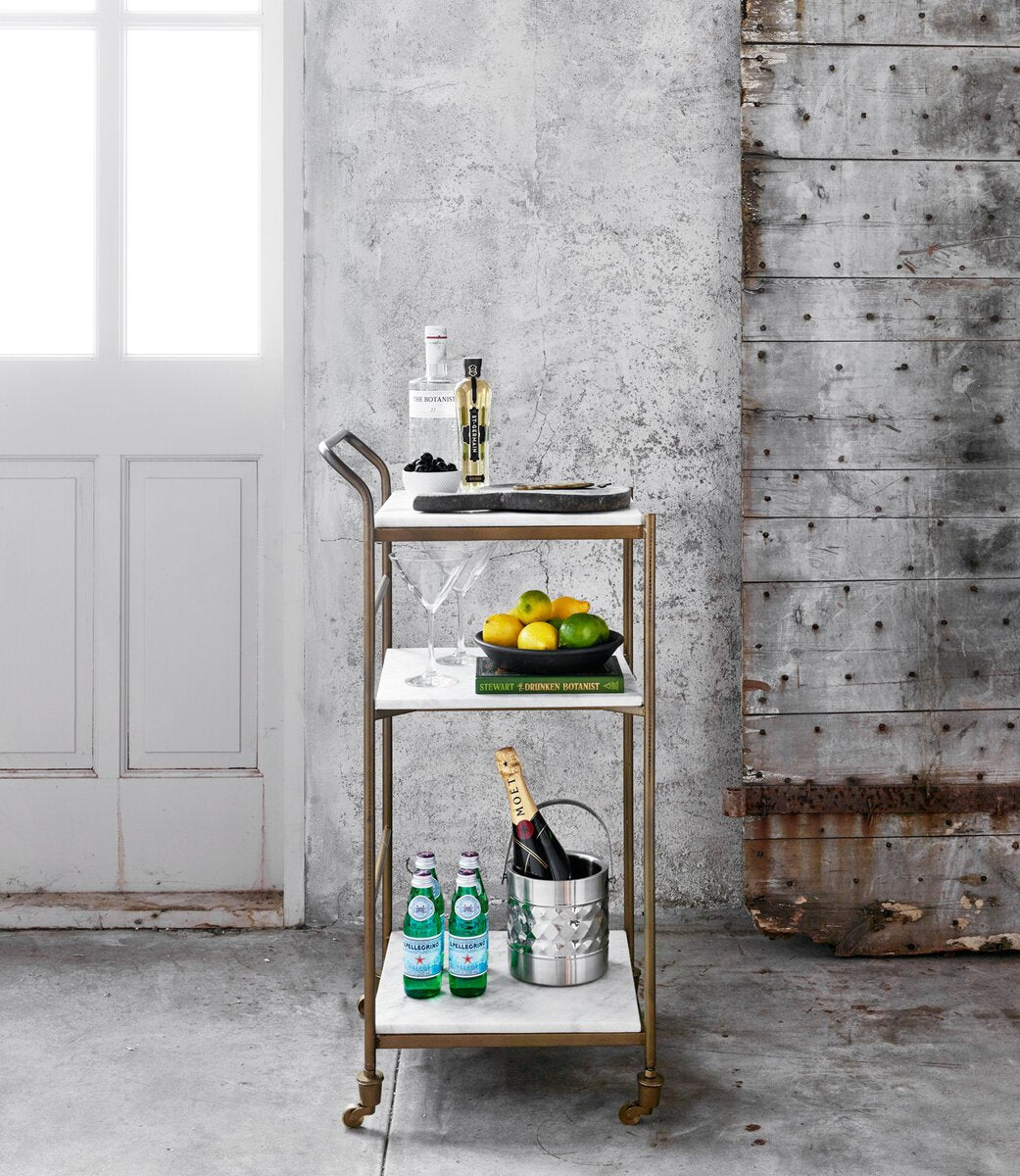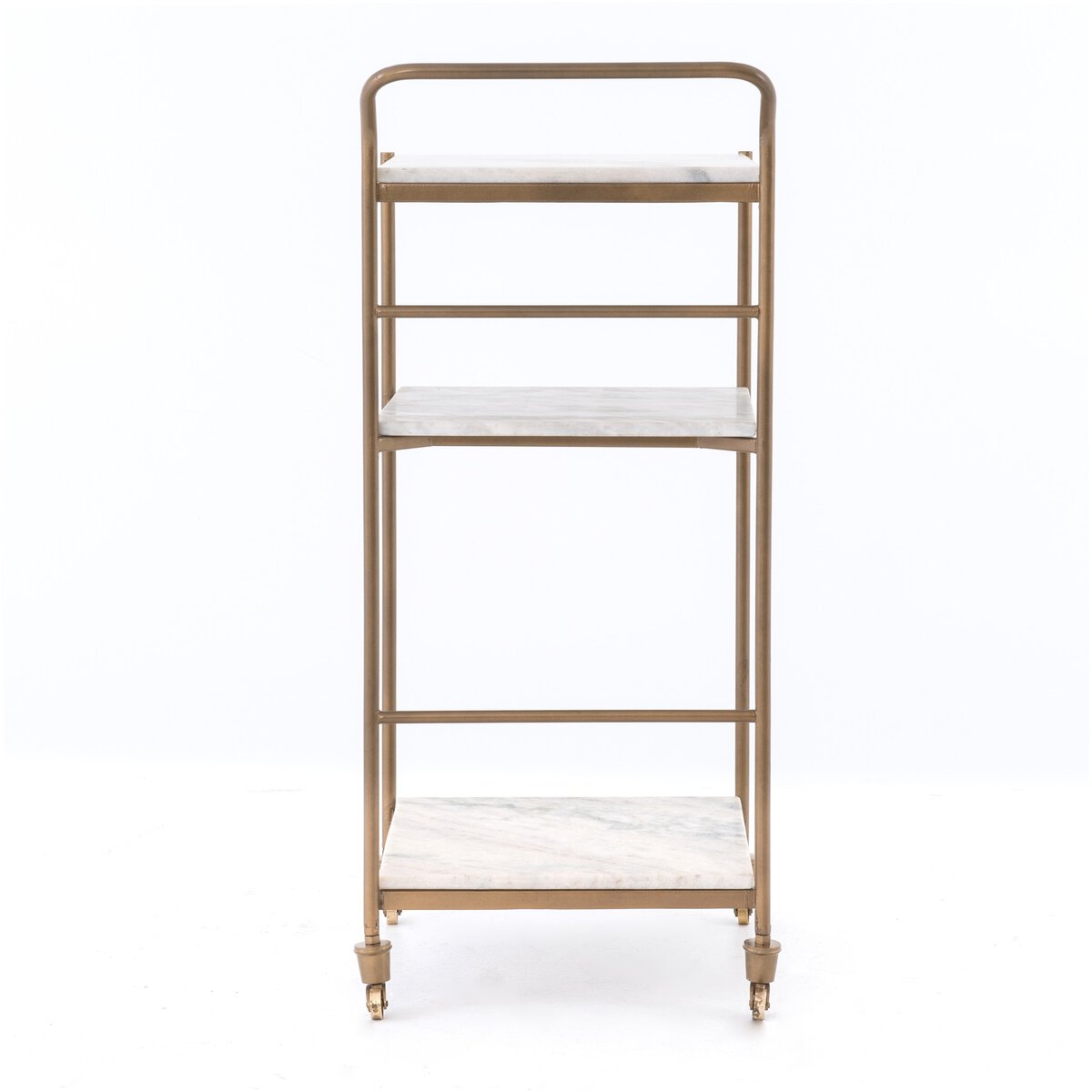 Add a pop of sophistication to any space. Classic white marble lays three tiers of smooth shelving for plenty of space. Antique brass frame and casters place a feminine spin on bar styling.
