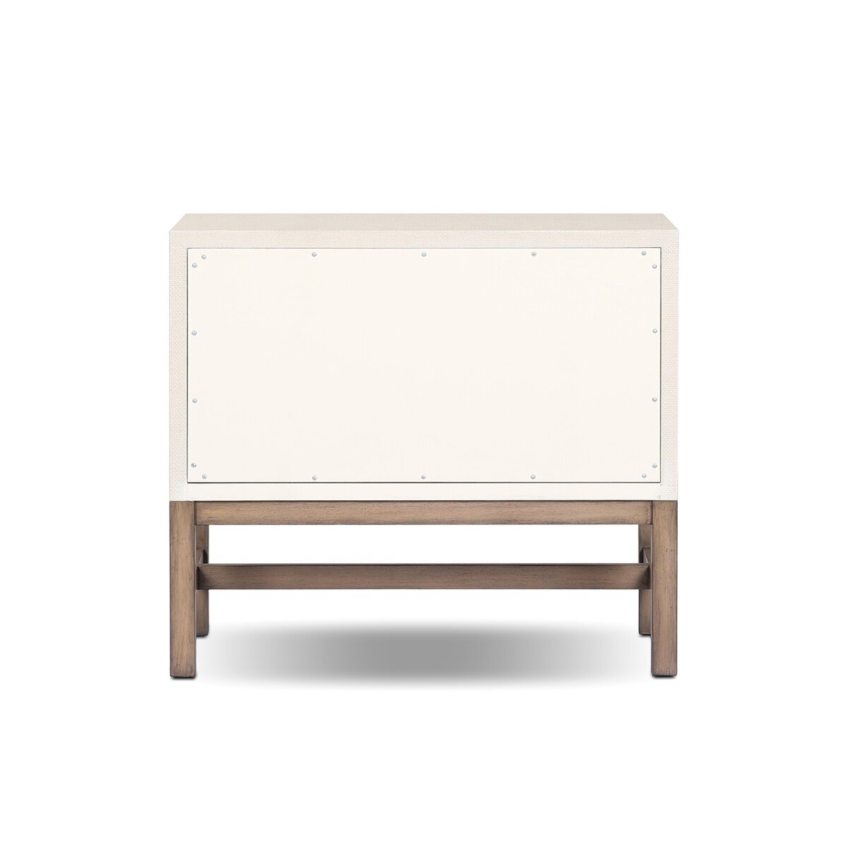 Woven ivory raffia offers a texture-driven take on bedside storage. Antique brass-finished iron hardware adorns dual drawers supported by a solid mahogany base.