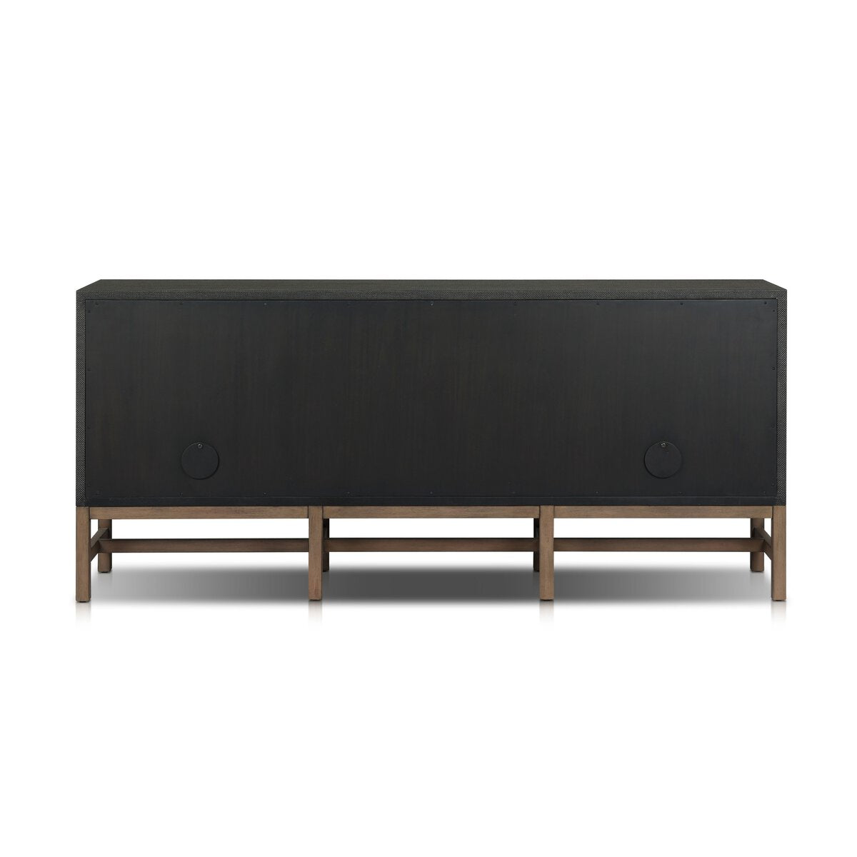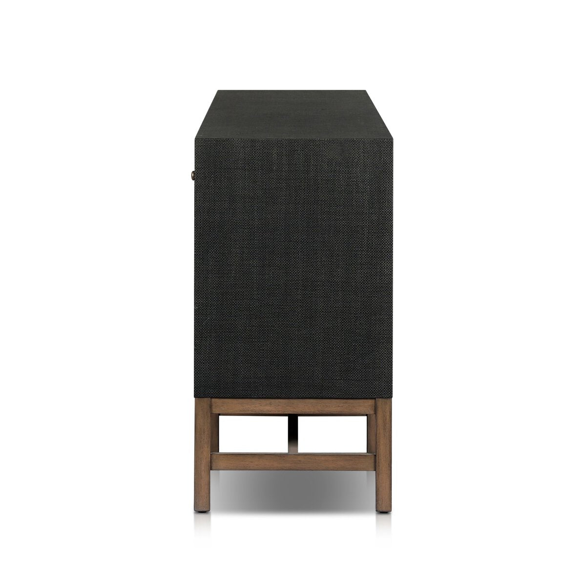 Woven ivory raffia places a texture-driven twist on sideboard storage. Five roomy drawers and two cabinets feature simple hardware finished in an antique brass, all supported by an open, airy base of solid mahogany.
