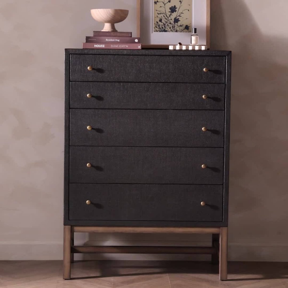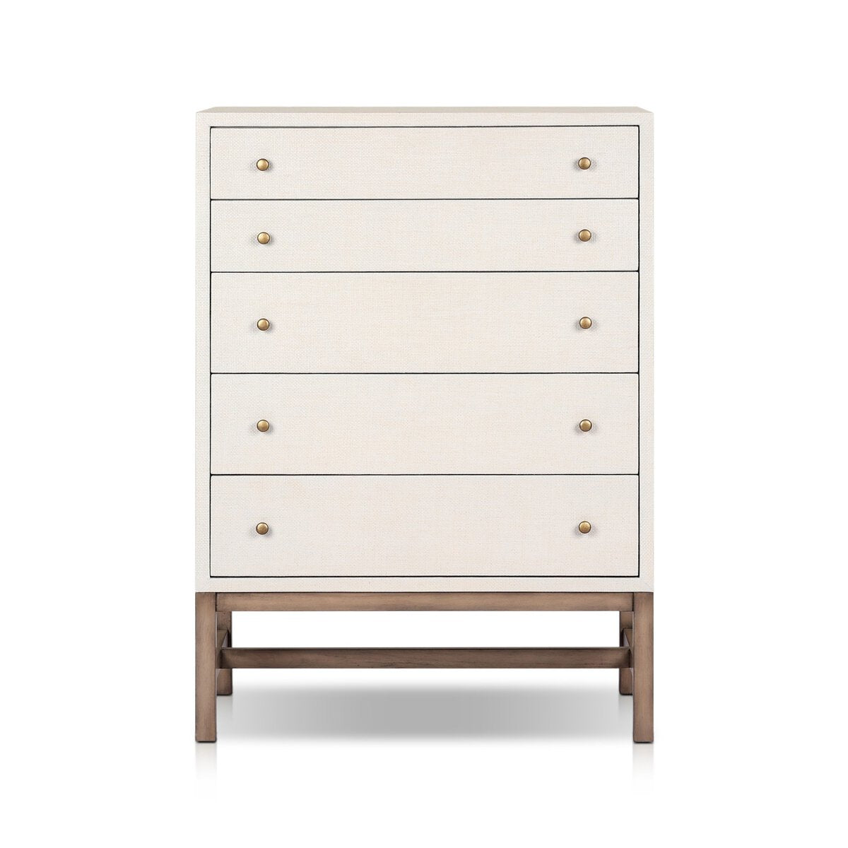 Overall Dimensions 34.00"w x 19.00"d x 47.50"hItem Number 246170-002Colors Ivory Painted Raffia, Russet MahoganyMaterials Sugar Palm, Solid MahoganyWeight 189.33 lbVolume 31.01 cu ftClearance from Floor 1 3.75"Drawer Depth 1 13.31"Drawer Depth 2 13.31"Drawer Height 1 2.95"Drawer Height 3 5.51"Drawer Width 1 30.27"Drawer Width 2 30.27"Door Type No DoorsDrawer Glide Color SilverDrawer Glide Type Undermount MetalDrawer Joinery English DovetailDrawer Quantity 5.00Drawer Stop Material NoneFrame Construction Joinery Bore and DowelFrame Construction Joinery Edge Banded VeneerFrame Construction Joinery English DovetailFrame Construction Joinery Mortise and TenonFunctionality DrawersHas Soft Close Drawers YesShape Type TallSuite FionaWeight Capacity 100 lb