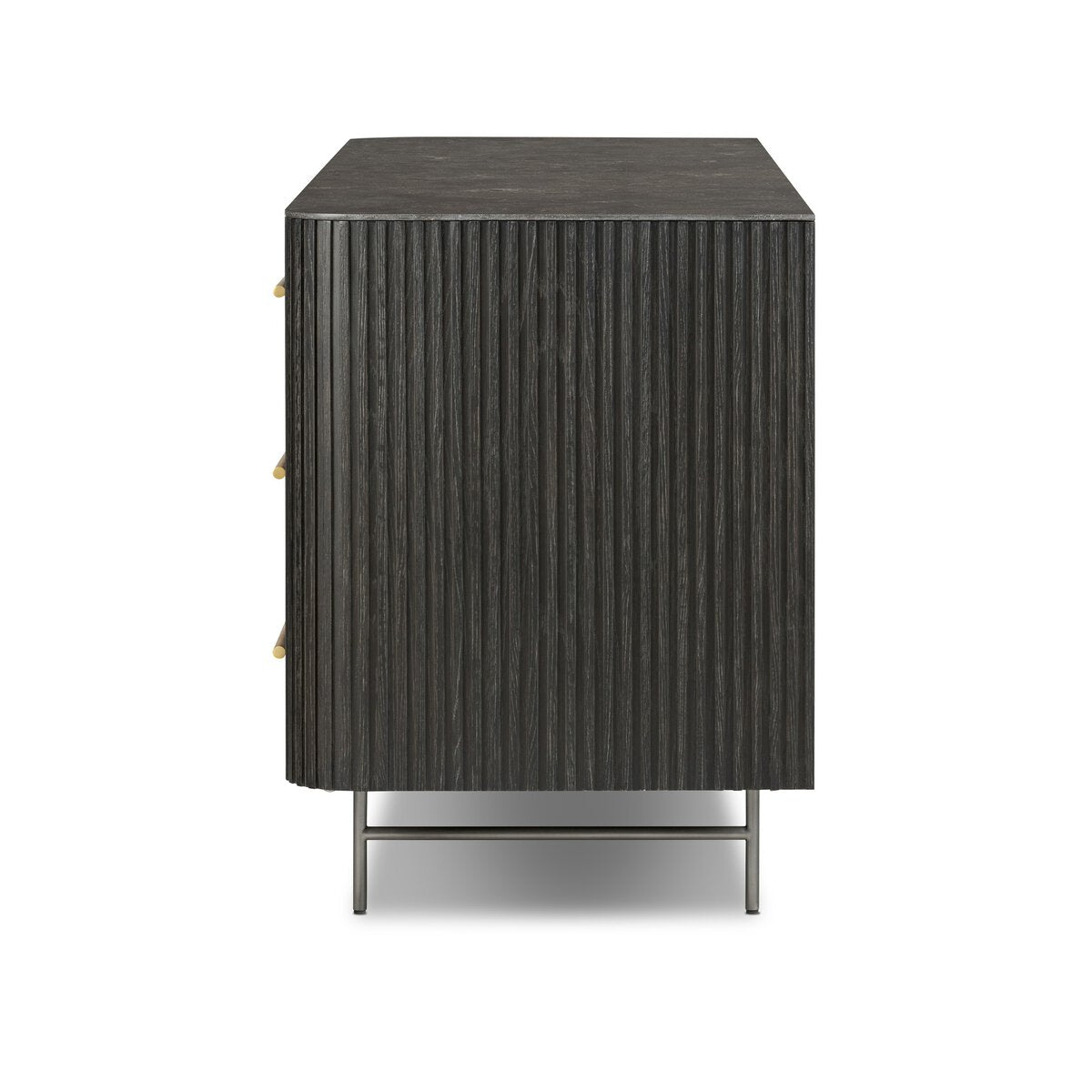 Rich with reeding for great texture and a linear look, brown-finished solid oak frames six spacious drawers with polished brass hardware and curved corners, while a bluestone top brings a beautifully complementary material mix to bedroom storage. White mineral lines and subtle color, texture and pattern variations are to be expected and speak to each stone's individual nature. This item has been modified to comply with the STURDY Act. See a full list of modified products and data changes in the “STURDY Act” file in the Downloads section below.