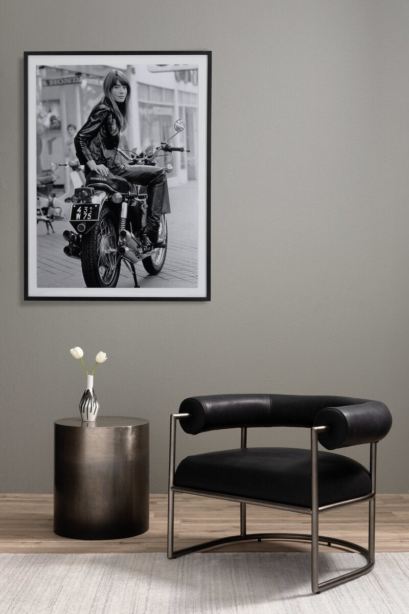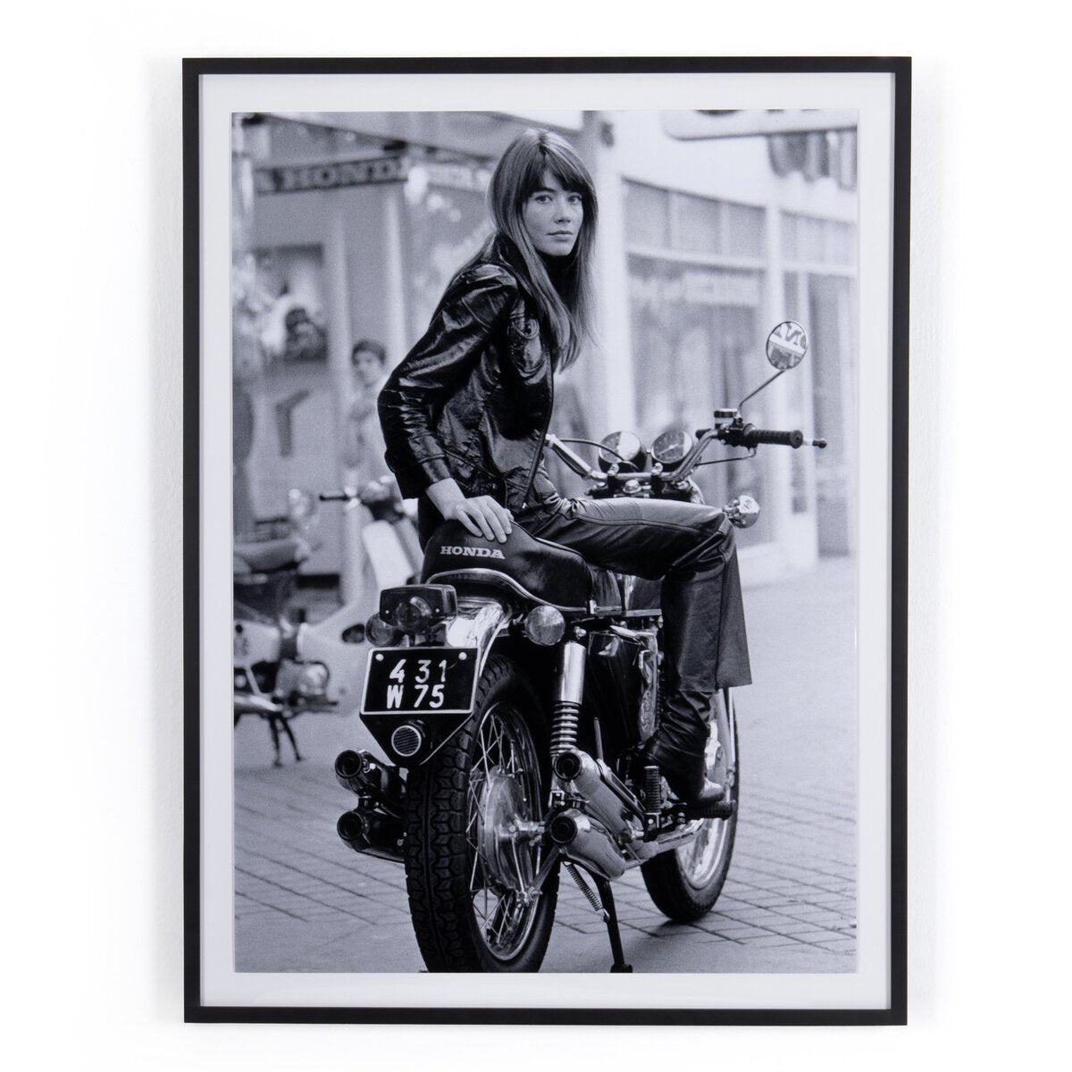 French songstress Françoise Hardy on a motorcycle in 1969. Photo by Reg Lancaster courtesy of Getty Images. Float-mounted and framed within black-finished American maple for a museum-quality look. Handmade in Austin, Texas, each print includes a certificate of authenticity commemorating the exclusive partnership between Getty Images and Four Hands Art Studio.