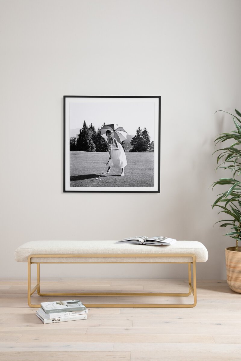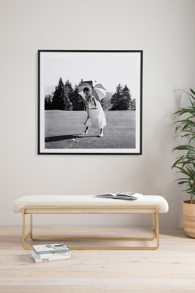 Belgian-born actress Audrey Hepburn takes in a game of gold. Photo courtesy of Getty Images' Hulton Archive – a "living museum" and largest photographic collection in private ownership. Float-mounted and framed within black-finished American maple for a museum-quality look. Handmade in Austin, Texas, each print includes a certificate of authenticity commemorating the exclusive partnership between Getty Images and Four Hands Art Studio.