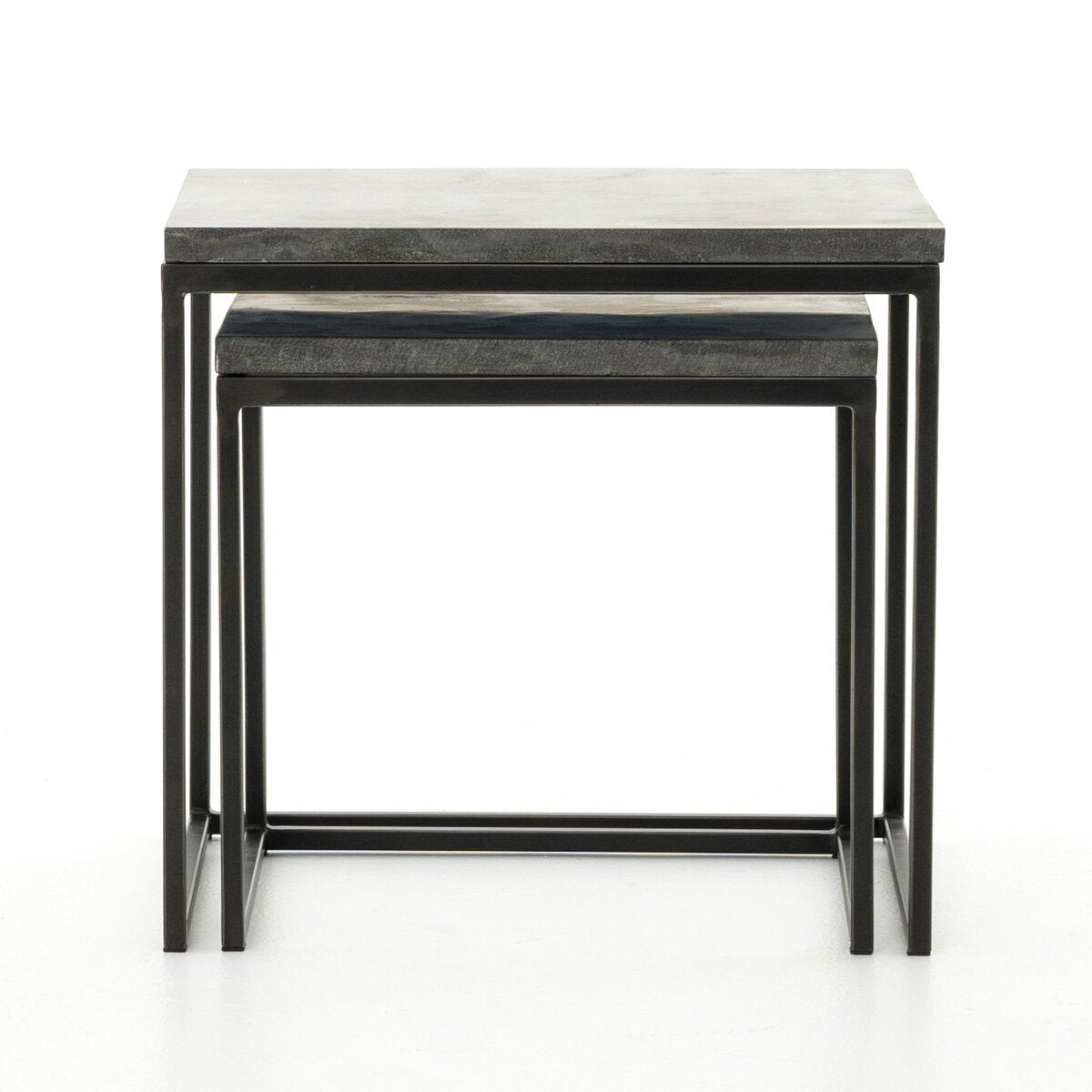 Spare beauty, casual elegance. A gunmetal-finished Parsons base with hand-rubbed, dimensional edges supports two rough-hewn bluestone slabs that feel found and perfectly placed. White mineral lines and subtle color, texture and pattern variations are to be expected and speak to each stone's individual nature.