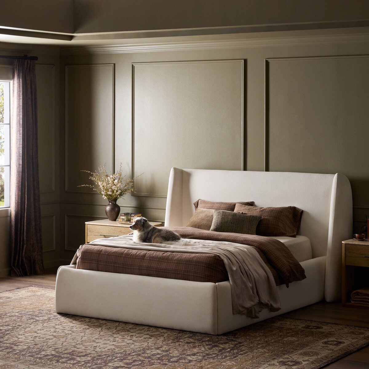 Overall Dimensions 85.00"w x 94.50"d x 51.50"hItem Number 248011-001Colors Crypton Nomad MarshmallowMaterials 92% Polyester, 8% Flax/LinenFabric PerformanceWeight 327.60 lbVolume 82.35 cu ftDistance between Slats 2.76"Floor to Top of Slat Height 10.94"Footboard Height 17.72"Footboard Thickness 5.98"Footboard Width 70.98"Headboard Height 51.50"Headboard Thickness 17.52"Headboard Width 84.96"Interior Dimension for Mattress Depth 81.02"Interior Dimension for Mattress Height 5.98"Interior Dimension for Mattress Width 61.02"Interior Frame Depth (Without Slats and Center Rail) 81.02"Interior Frame Width (Without Slats and Center Rail) 61.02"Side Rails Height 16.93"Side Rails Length 85.98"Side Rails Thickness 5.98"Adjustable Bed Frame Compatible YesBed Backing Dark FabricBed Material UpholsteredBox Spring Required Not RequiredCleaning Code