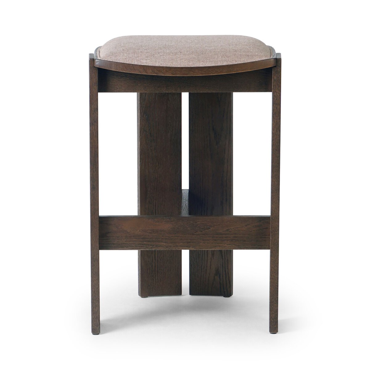 Simple yet bold. The wide three-leg design of this backless oak bar stool pairs seamlessly with a curved upholstered seat for an architecturally interesting form.