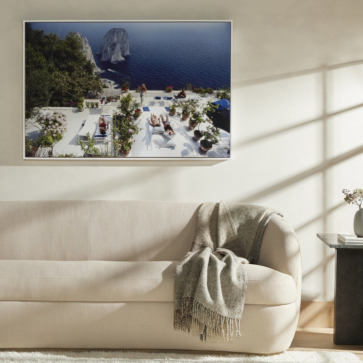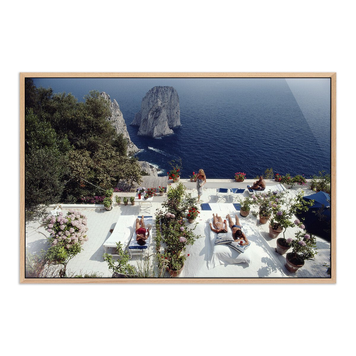 A specially selected work from the late influential photographer Slim Aarons is printed using ultra-modern ChromaLuxe technology for the first time ever. High in definition and gloss, images are printed in vibrant, saturated color on fade- and scratch-resistant recycled aluminum. Each is float-mounted with hand-selected framing designed to complement the print. Handmade in Austin, Texas, each piece includes a certificate of authenticity commemorating the partnership between Slim Aarons, Getty Images Gallery and Four Hands Art Studio. Photo courtesy of Getty Images.