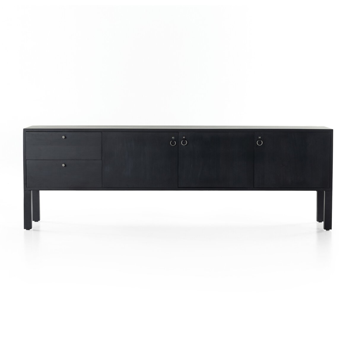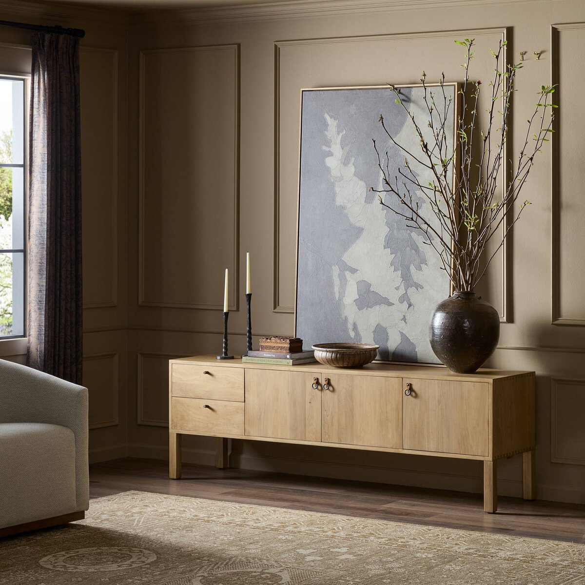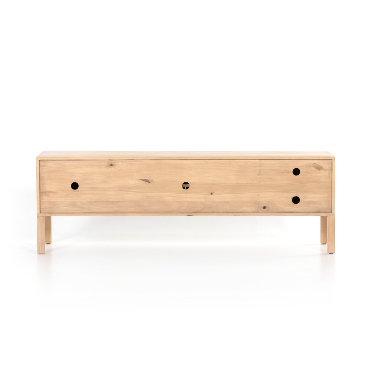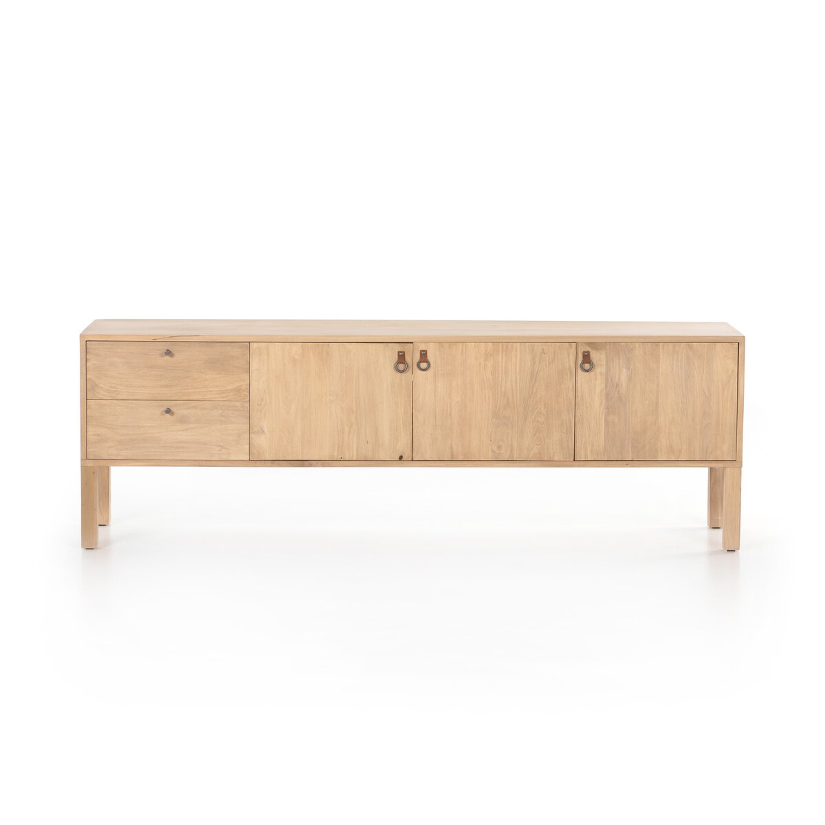Overall Dimensions 80.00"w x 19.00"d x 26.25"hItem Number 223975-001Colors Dry Wash Poplar, Toffee LeatherMaterials Solid Poplar, Top Grain LeatherWeight 112.43 lbVolume 23.98 cu ftClearance from Floor 1 10.24"Door Height 1 14.37"Door Height 2 7.20"Door Thickness 1 0.79"Door Thickness 2 0.79"Door Width 1 19.61"Door Width 2 19.61"Interior Section Depth 1 16.93"Interior Section Depth 2 16.93"Interior Section Depth 3 16.93"Interior Section Depth 4 16.93"Interior Section Height 1 14.37"Interior Section Height 2 14.37"Interior Section Height 3 7.09"Interior Section Height 4 7.09"Interior Section Width 1 38.39"Interior Section Width 2 19.29"Interior Section Width 3 19.29"Interior Section Width 4 19.29"Removable Shelf (Fixed or Adjustable) Depth 1 14.96"Removable Shelf (Fixed or Adjustable) Depth 2 14.96"Removable Shelf (Fixed or Adjustable) Height 1 0.79"Removable Shelf (Fixed or Adjustable) Height 2 0.79"Removable Shelf (Fixed or Adjustable) Width 1 38.39"Removable Shelf (Fixed or Adjustable) Width 2 19.17"Cord Management YesDoor Closure Catch Type MagneticDoor Qty 5.00Door Type HingedDrawer Glide Type NoneDrawer Stop Material NoneFrame Construction Joinery English DovetailFrame Construction Joinery Mortise and TenonFrame Construction Joinery Pocket Joint with ScrewsFrame Construction Joinery Tongue and GrooveFunctionality DoorsFunctionality DrawersFunctionality ShelvesHas Leveler YesHinge Type CabinetryInterior Section Quantity 4.00Protective Feet Leg LevelersRecommended Shelf Capacity (kg) 18.14Recommended Shelf Capacity (lbs) 40.00Removable Shelf YesRemovable Shelf Qty 2.00Suite Isador