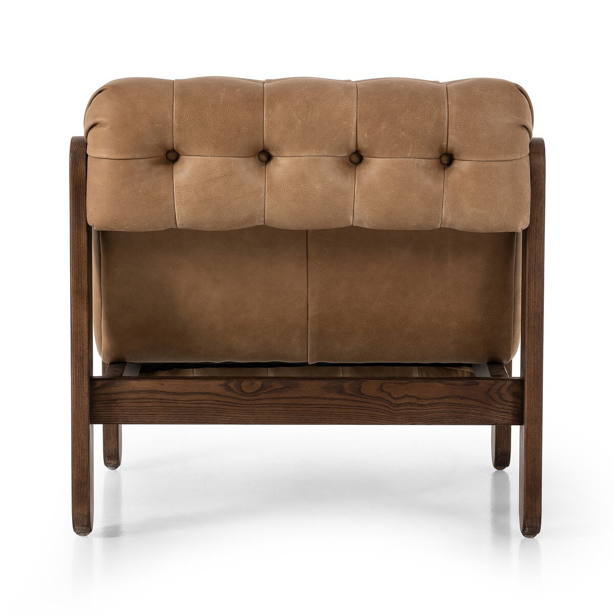 Plush button-tufted leather upholstery seems to drape over the unique frame of this deep accent chair. Covered in a thick-cut leather with natural graining throughout for added movement.