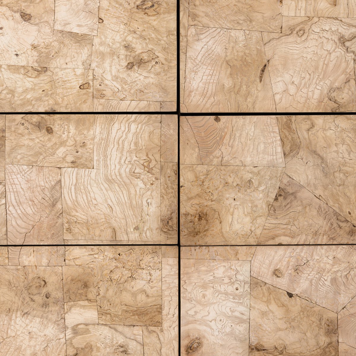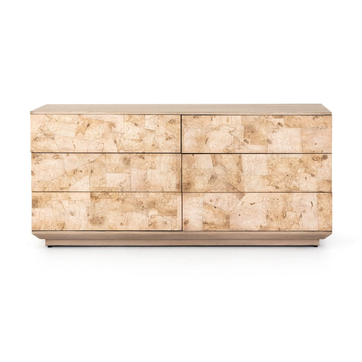 A stunning statement piece. Atop a stacked plinth base, white-finished mahogany encases six drawer fronts of bleached burl with organic patchwork, cut and placed by hand. Push-latch open for a clean, seamless look.