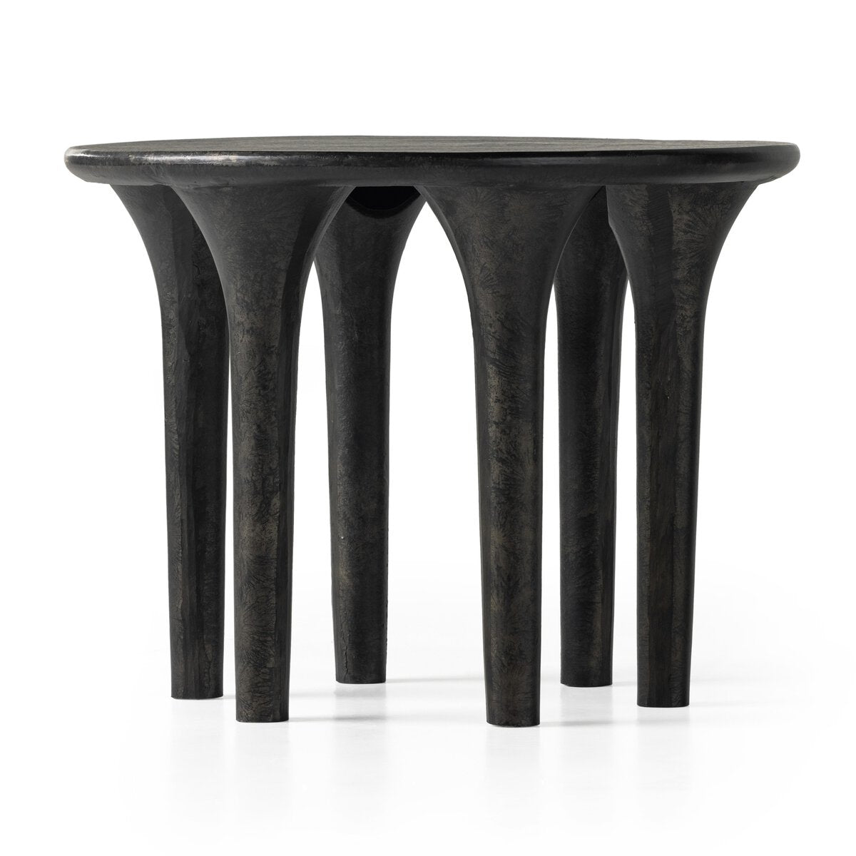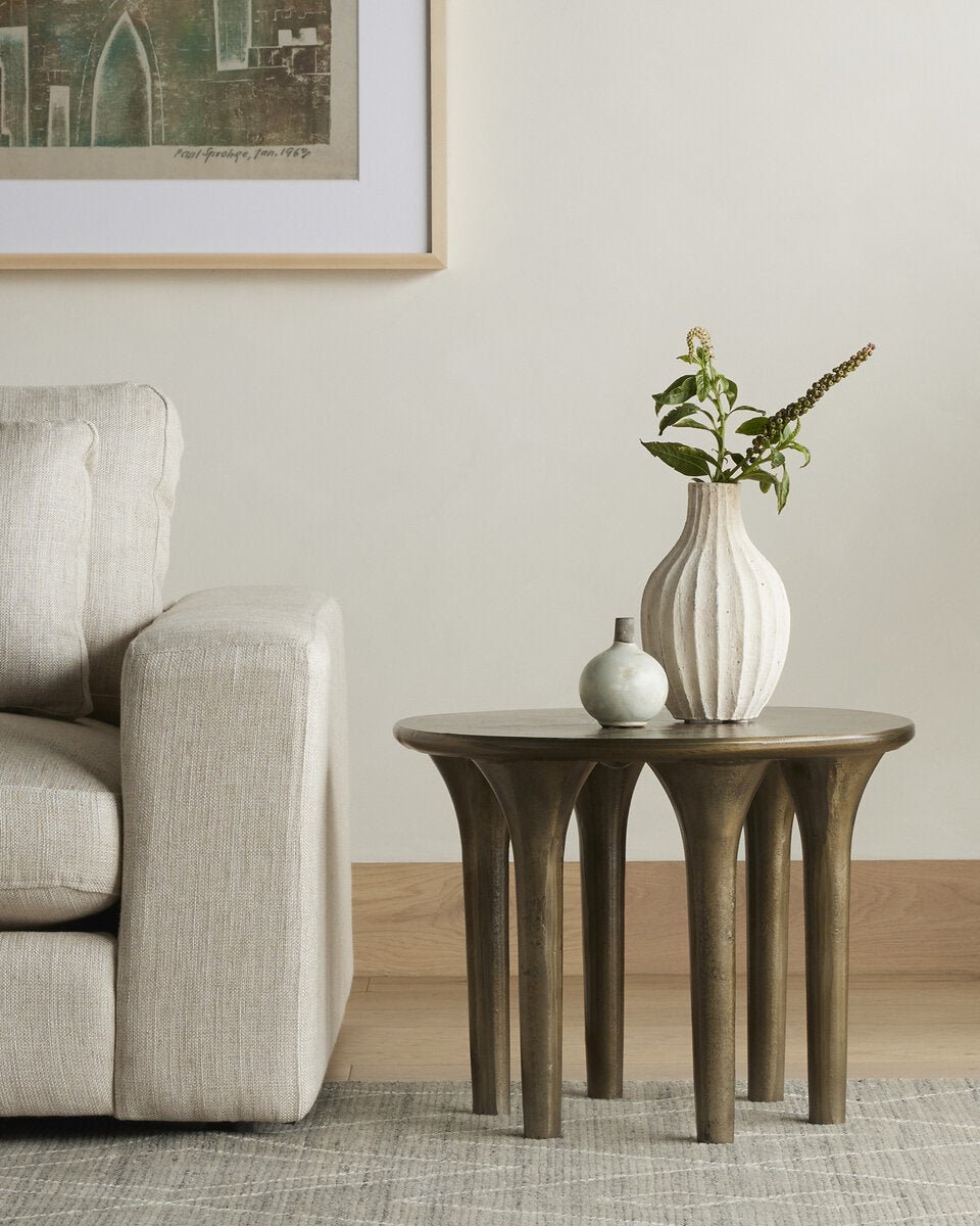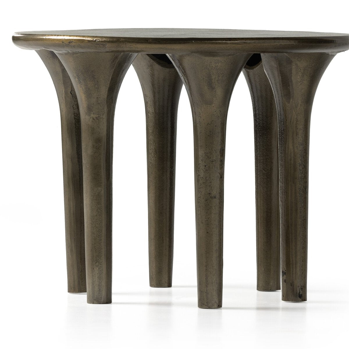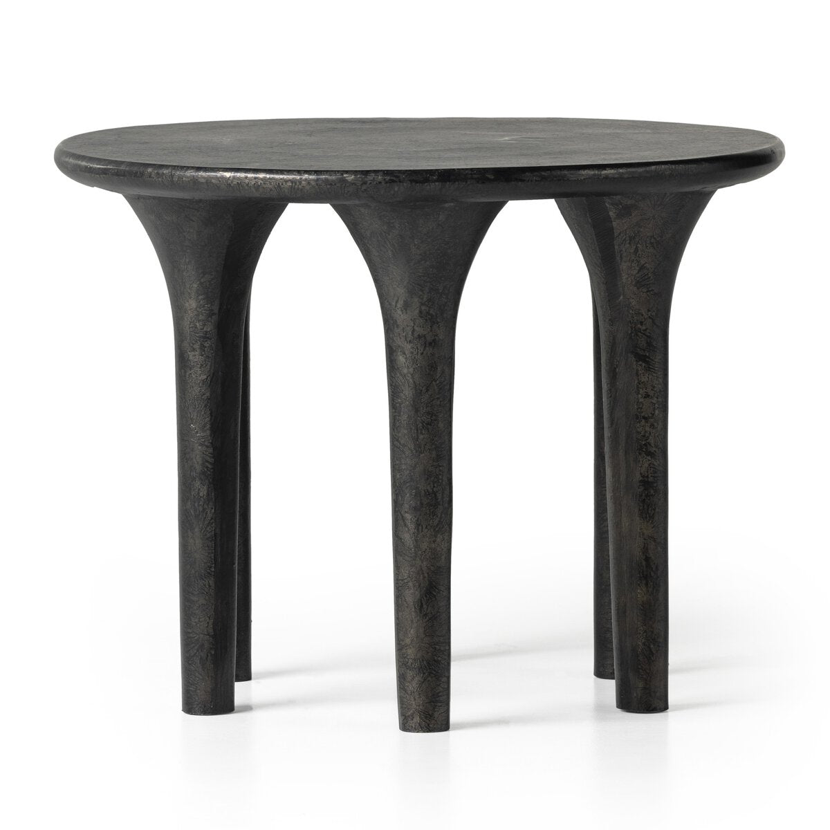 Overall Dimensions 22.00"w x 22.00"d x 17.00"hItem Number 233026-001Colors Aged BronzeMaterials AluminumWeight 30.47 lbVolume 7.10 cu ftClearance from Floor 1 16.00"Distance between Legs (Front to Back) 1 12.00"Distance between Legs (Side to Side) 1 6.00"Leg/Base Depth 1 1.50"Leg/Base Height 1 16.00"Leg/Base Width 1 1.50"Overhang Width 1 1.50"Tabletop Thickness 1.00"Drawer Glide Type NoneDrawer Stop Material NoneFunctionality NoneShape Type RoundSuite KeldenWeight Capacity 100 lb