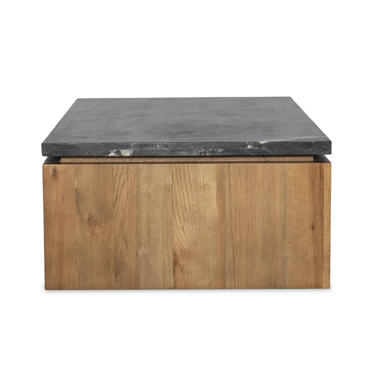 Mixed materials update this waterfall-style coffee table, as a warm oak base pairs with a sleek black marble tabletop.