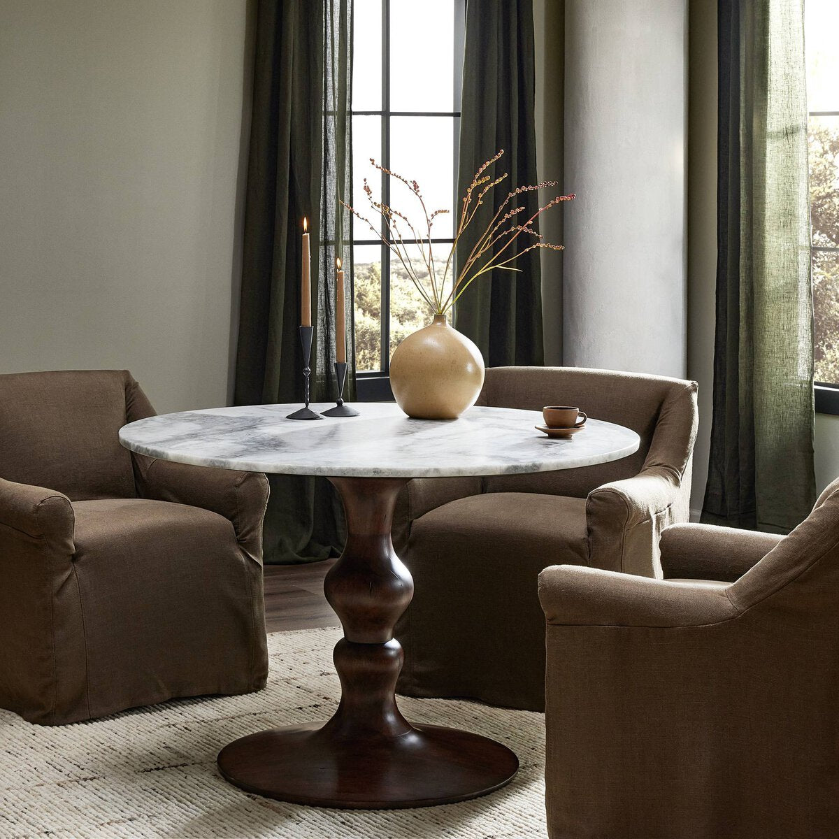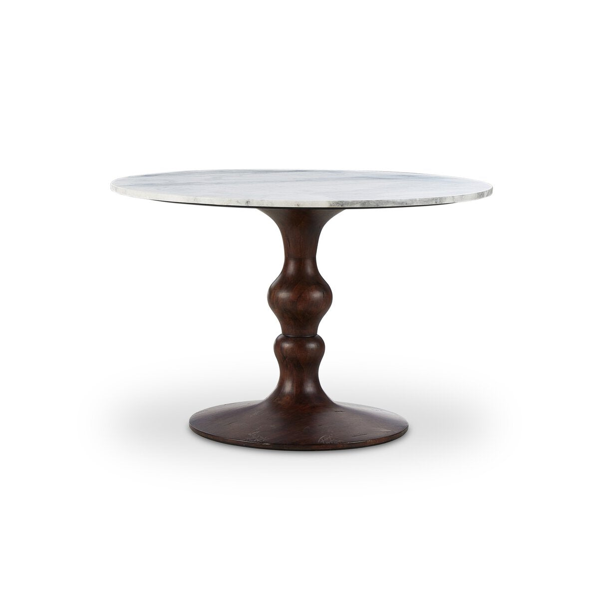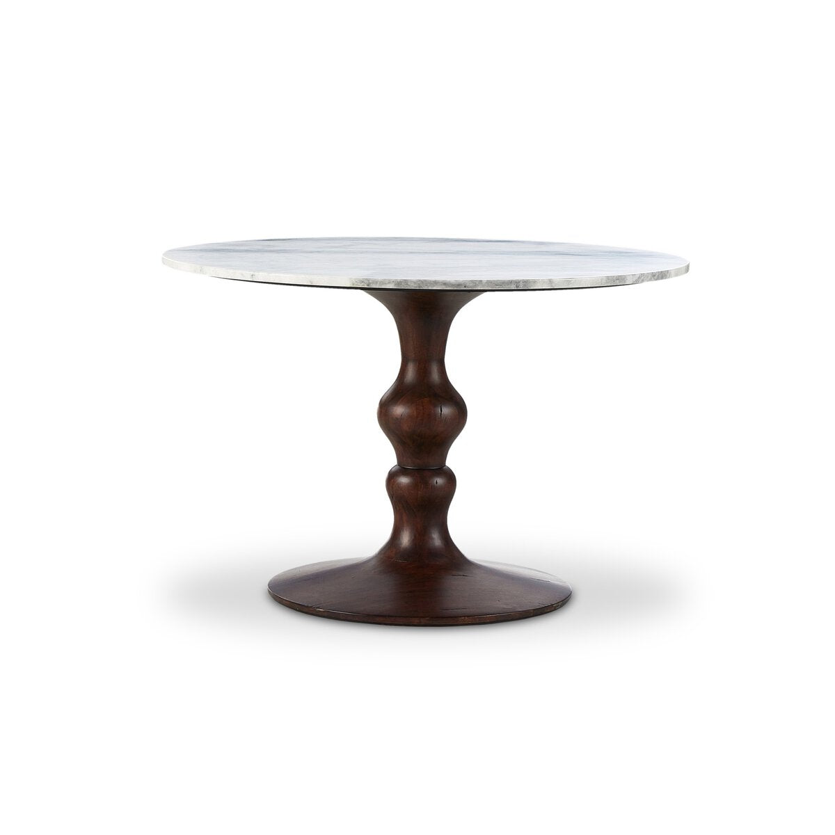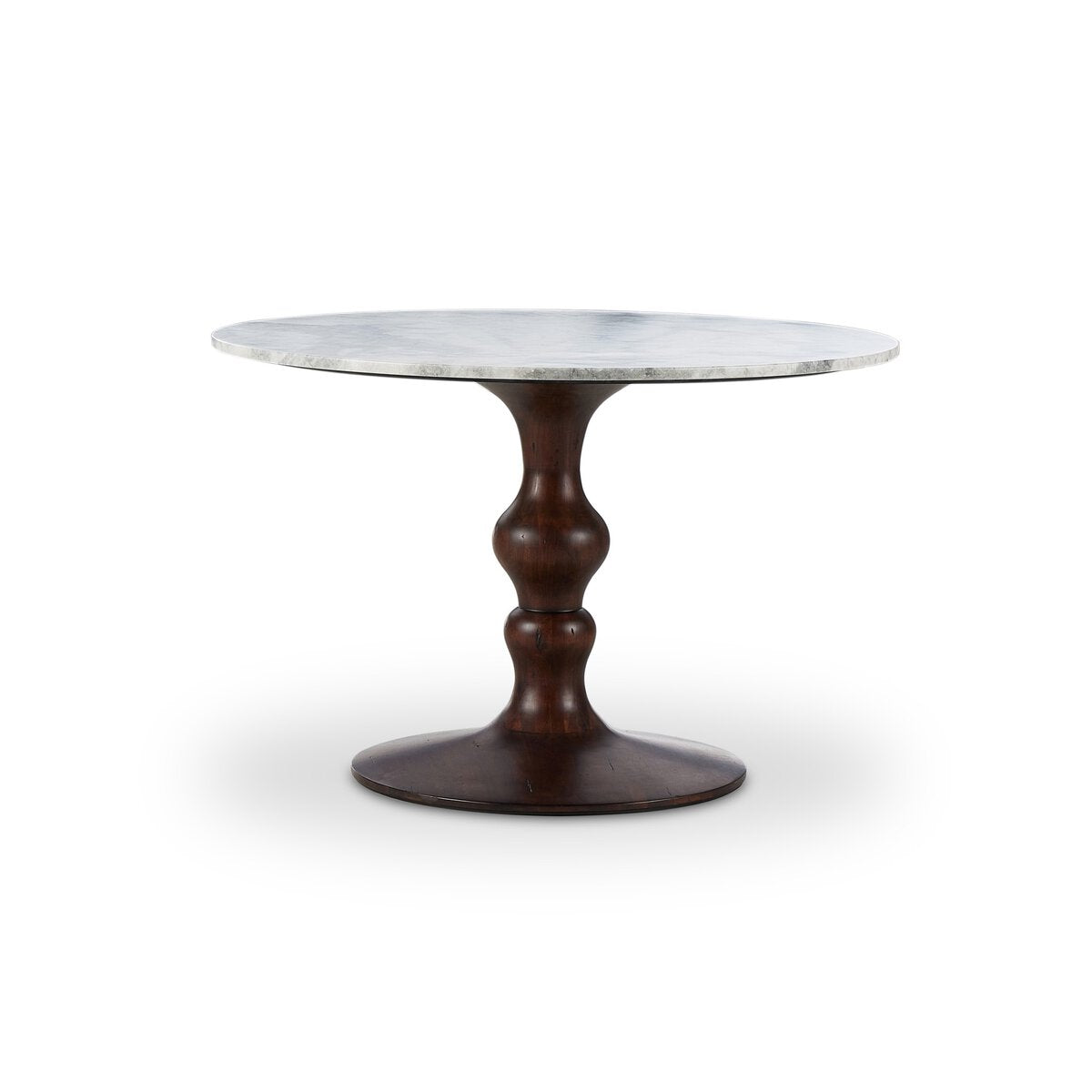 Overall Dimensions 48.00"w x 48.00"d x 30.50"hItem Number 235915-001Colors White Statuario Marble, Dark Brown AcaciaMaterials Solid Marble, Solid AcaciaWeight 231.48 lbVolume 34.04 cu ftClearance from Floor 1 29.25"Leg/Base Depth 1 27.75"Leg/Base Height 1 29.25"Leg/Base Width 1 27.75"Opening for Seating Height 29.25"Overhang Width 1 10.13"Tabletop Thickness 0.75"Weight Capacity 100 lb