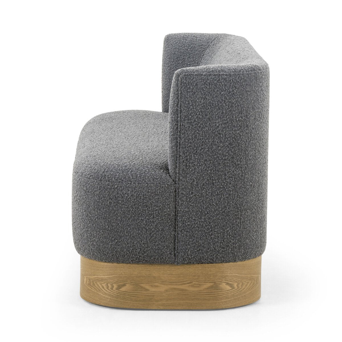 Style takes shape. Comfortably curved bench seating is upholstered in a chunky off-white boucle, with water-repellent performance fabric for a modern touch. A plinth-style ash veneer base works casual contrast into the mix. Perfectly sized for a cozy breakfast nook; pair up to suit a larger space. Performance fabrics are specially created to withstand spills, stains, high traffic and wear, ensuring long-term comfort and unmatched durability.