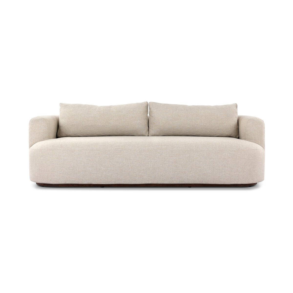 Settle into comfort outdoors. An inviting outdoor sofa features a rounded, inflated silhouette crafted from solid FSC®-certified teak. Finished in high-performance upholstery, with welcoming wide arms and loose back cushions for easy lounging. Cover or store indoors during inclement weather and when not in use.